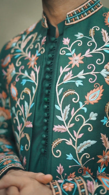 Dark Green Multi Colour Hand Work Front Open Prince Coat