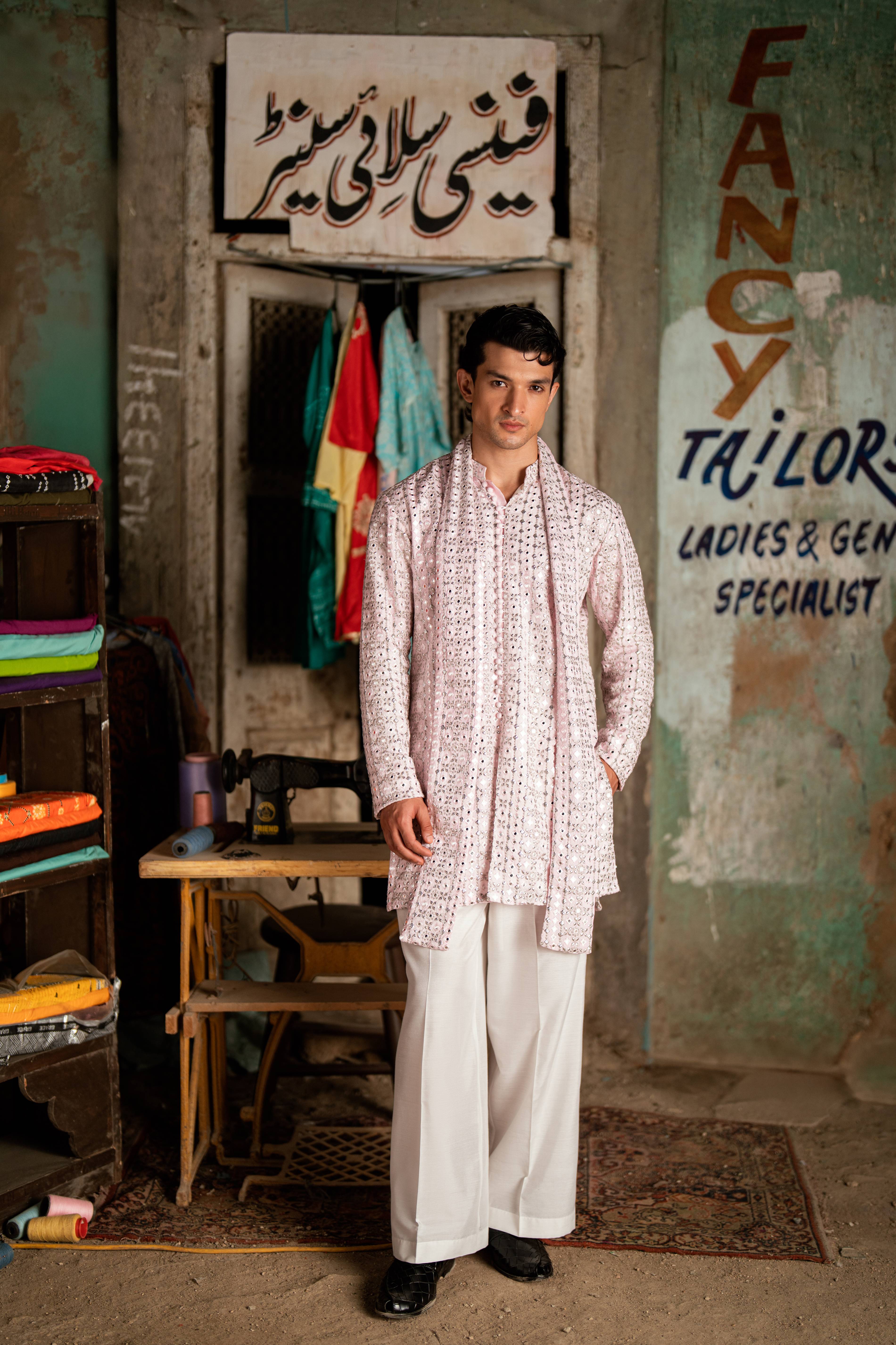 - Straight cut kurta with full sleeves, paired with wide leg trousers (shalwar-style) for a traditional silhouette