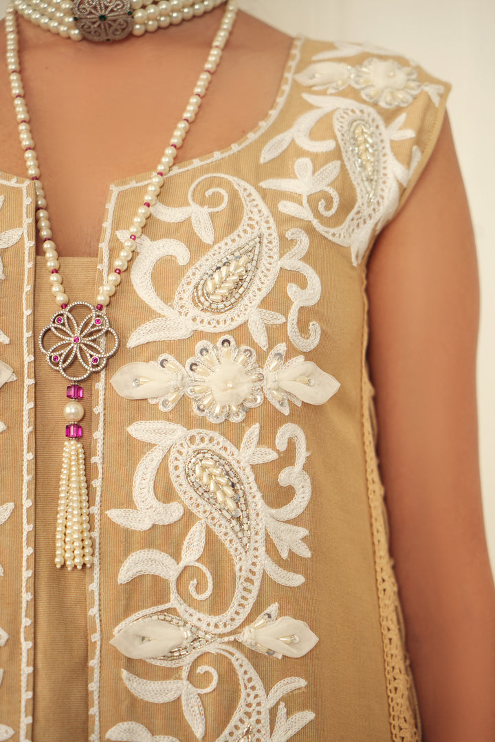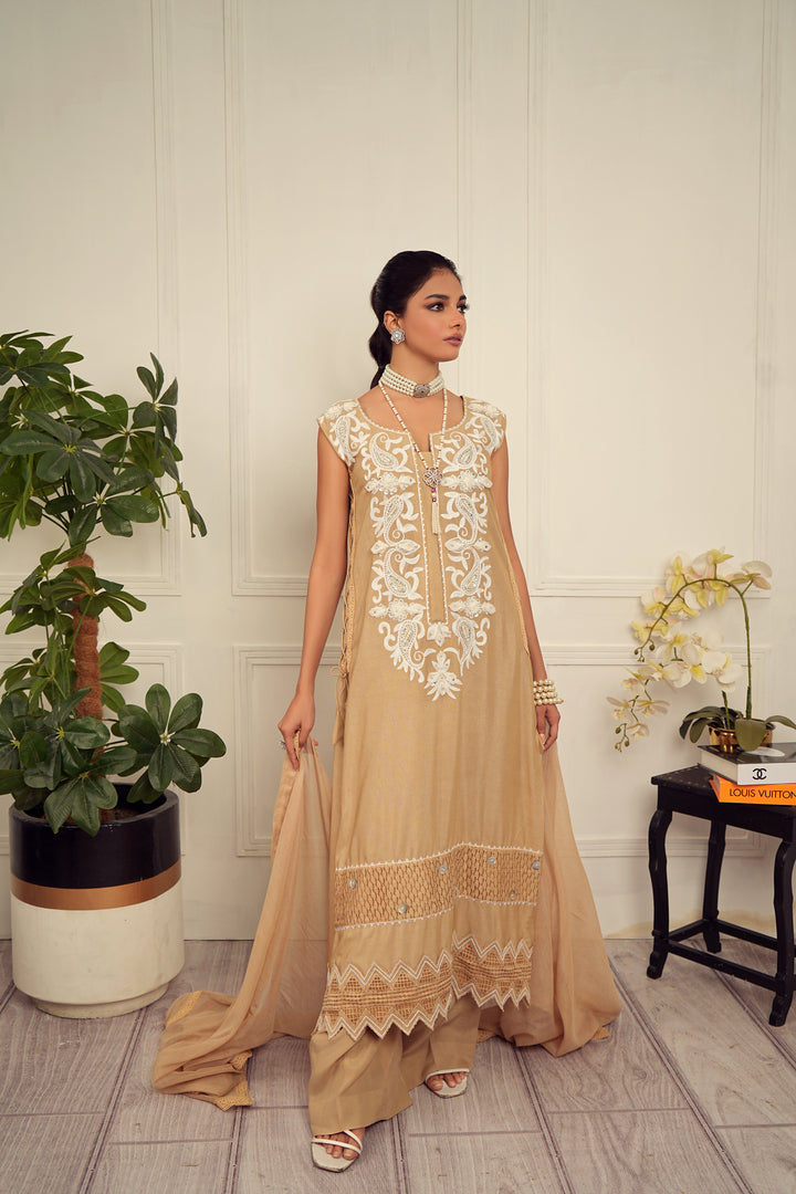 - Khaadi net, silk, AARI handwork, organza, and laces with embellishments.