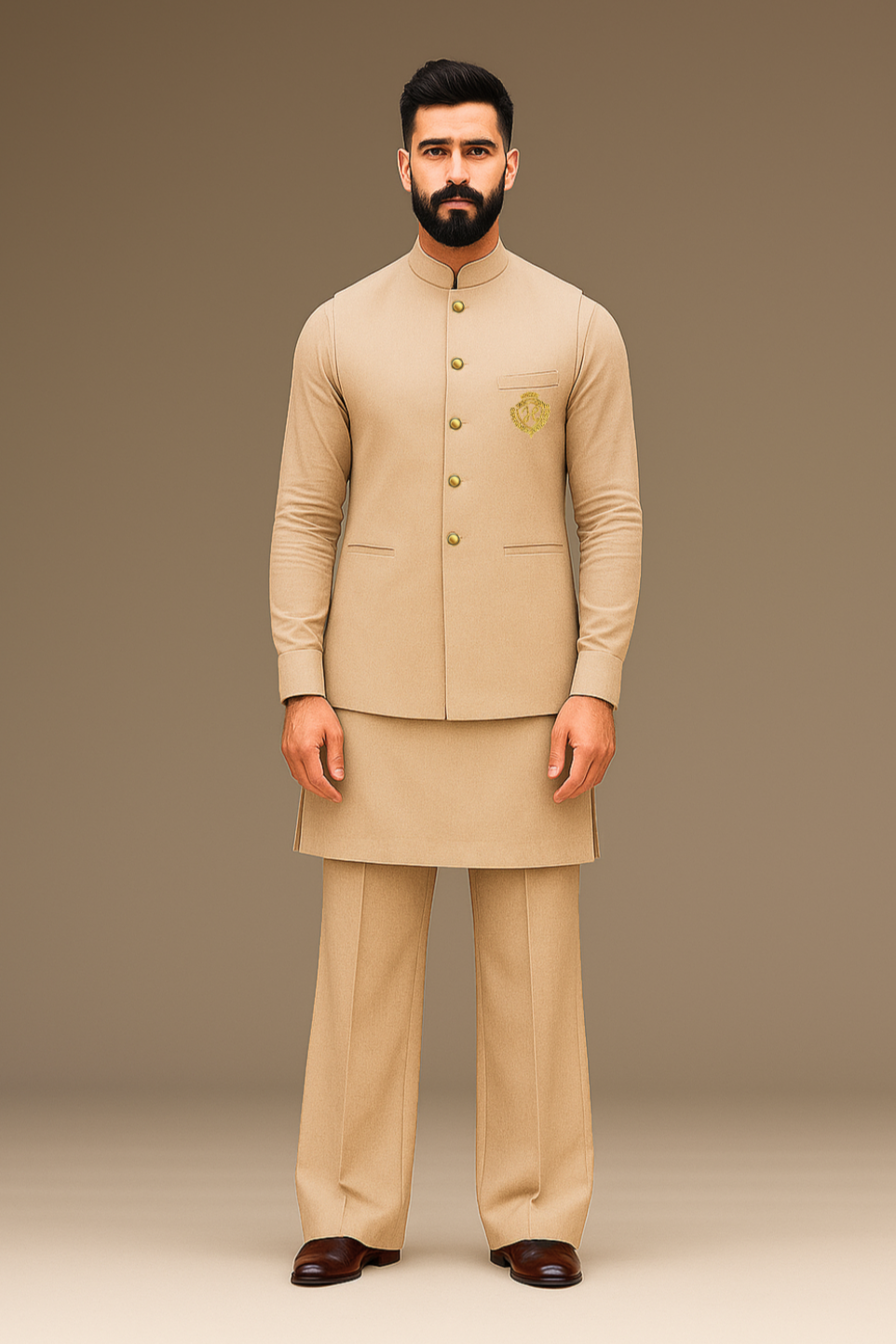 BEIGE WAISTCOAT WITH KURTA/PAJAMA - COTTON SILK