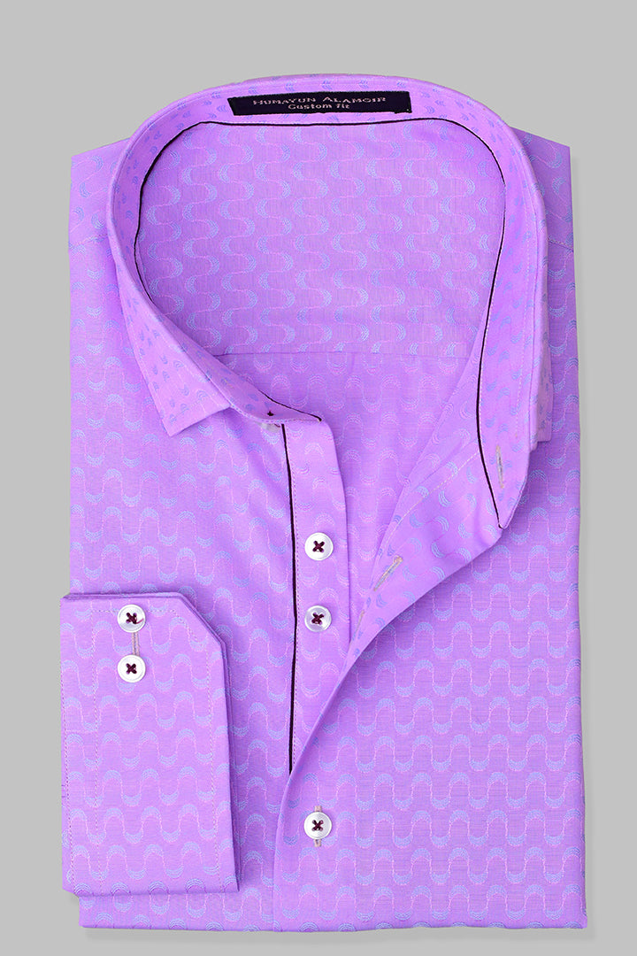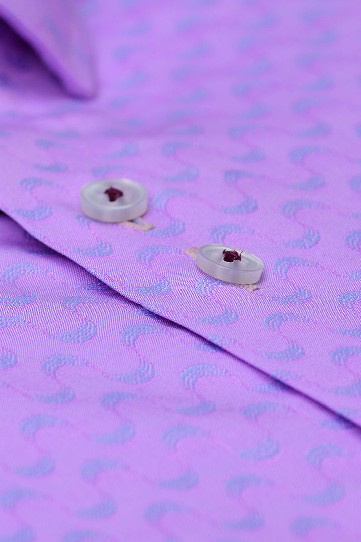 • Lavender coloured printed shirt is tailored slim fit and features a normal spread collar, single cuff, and black pearl buttons.