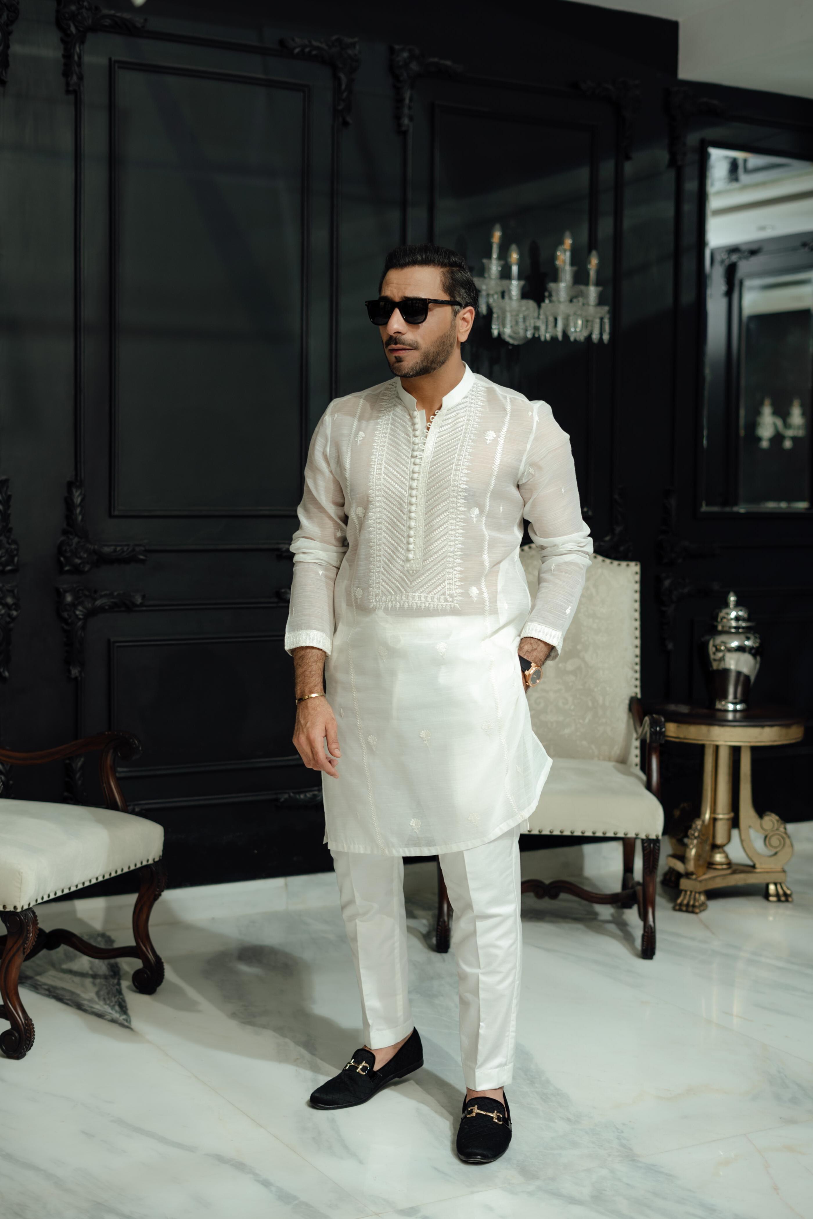 LUXURY WHITE EMBOSSED KURTA WITH SEQUENCE DETAILS