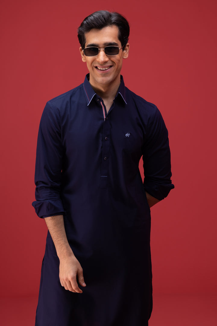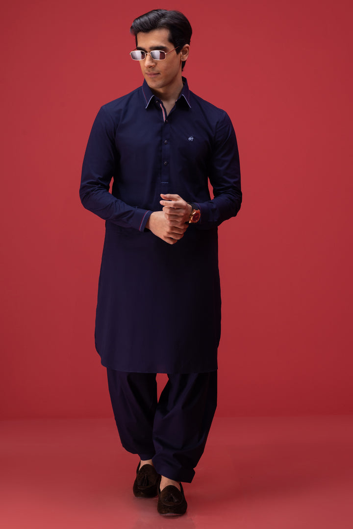 - Stretch cotton navy blue shalwar kameez with shirt collar, pati, cuff detailing, round daman, and a front H logo.