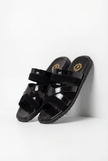 Eid Prestige Cross-Strap Slip-On by Humayun Alamgir. Crafted in a deep black colour, this premium sandal features a sleek glossy finish combined with soft suede-textured straps for a bold yet elegant look.