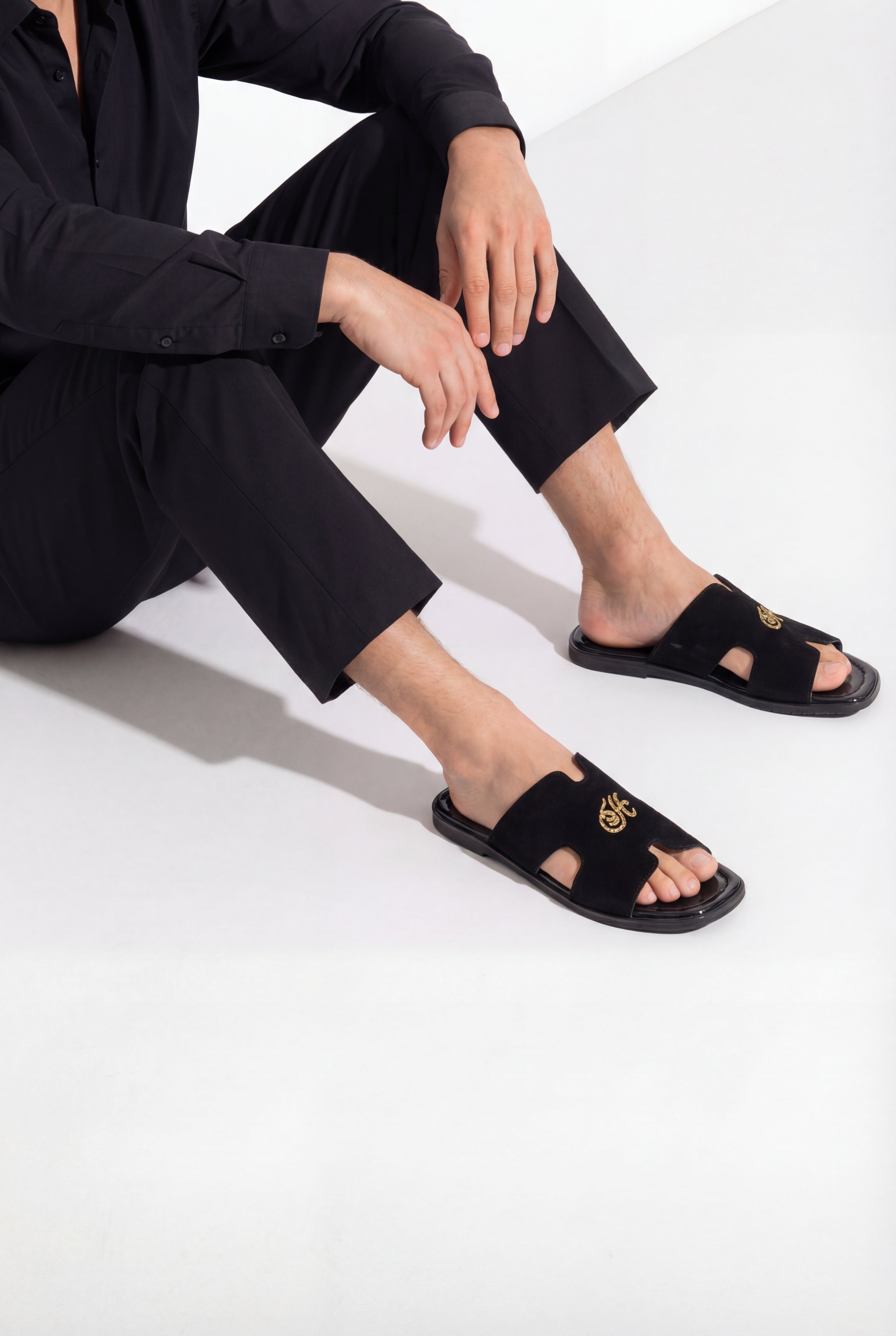 Designed in deep black velvet with a finely embroidered gold monogram, this slip-on embodies sophistication and festive charm. The sleek open-front design enhances breathability while maintaining a structured, premium look.