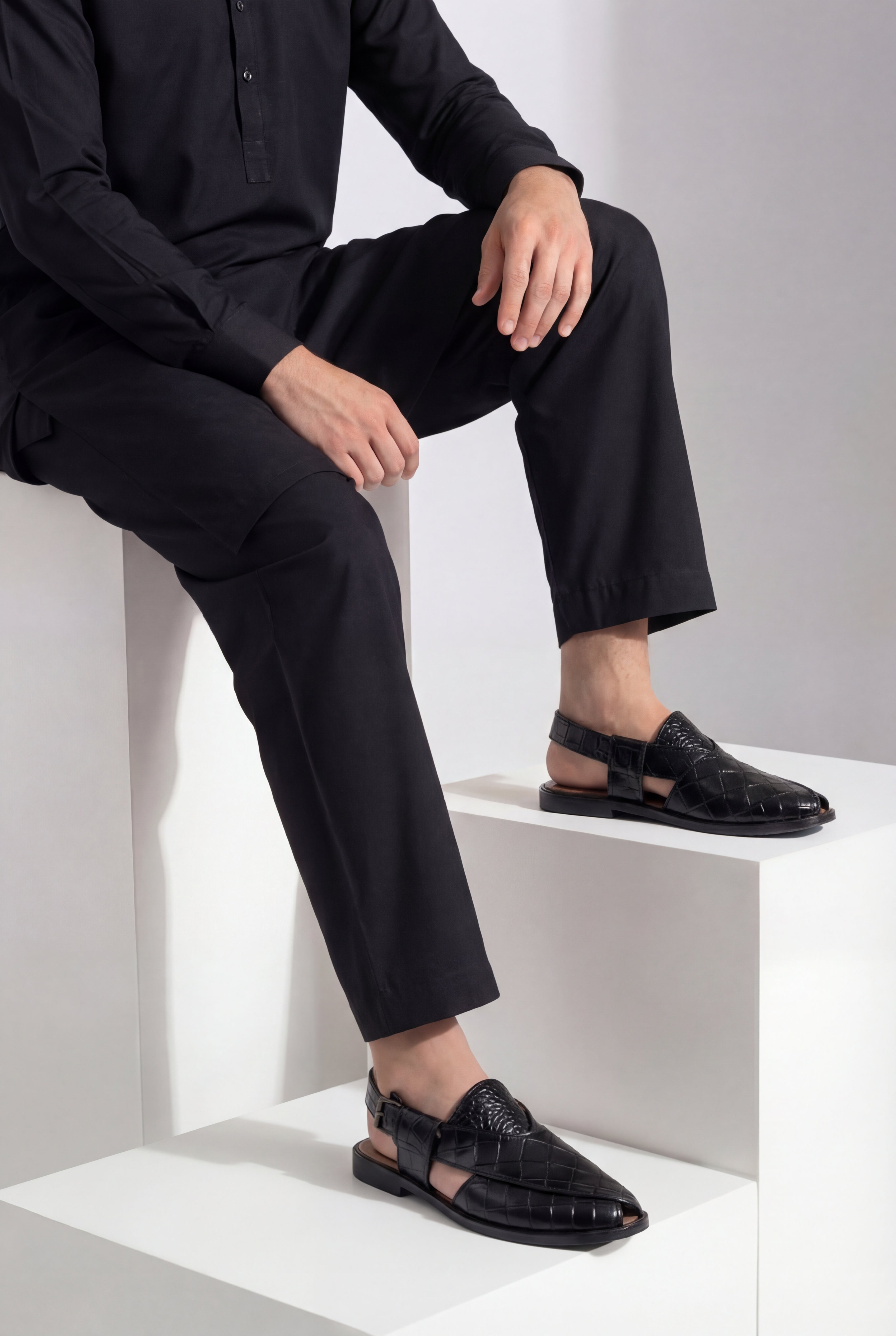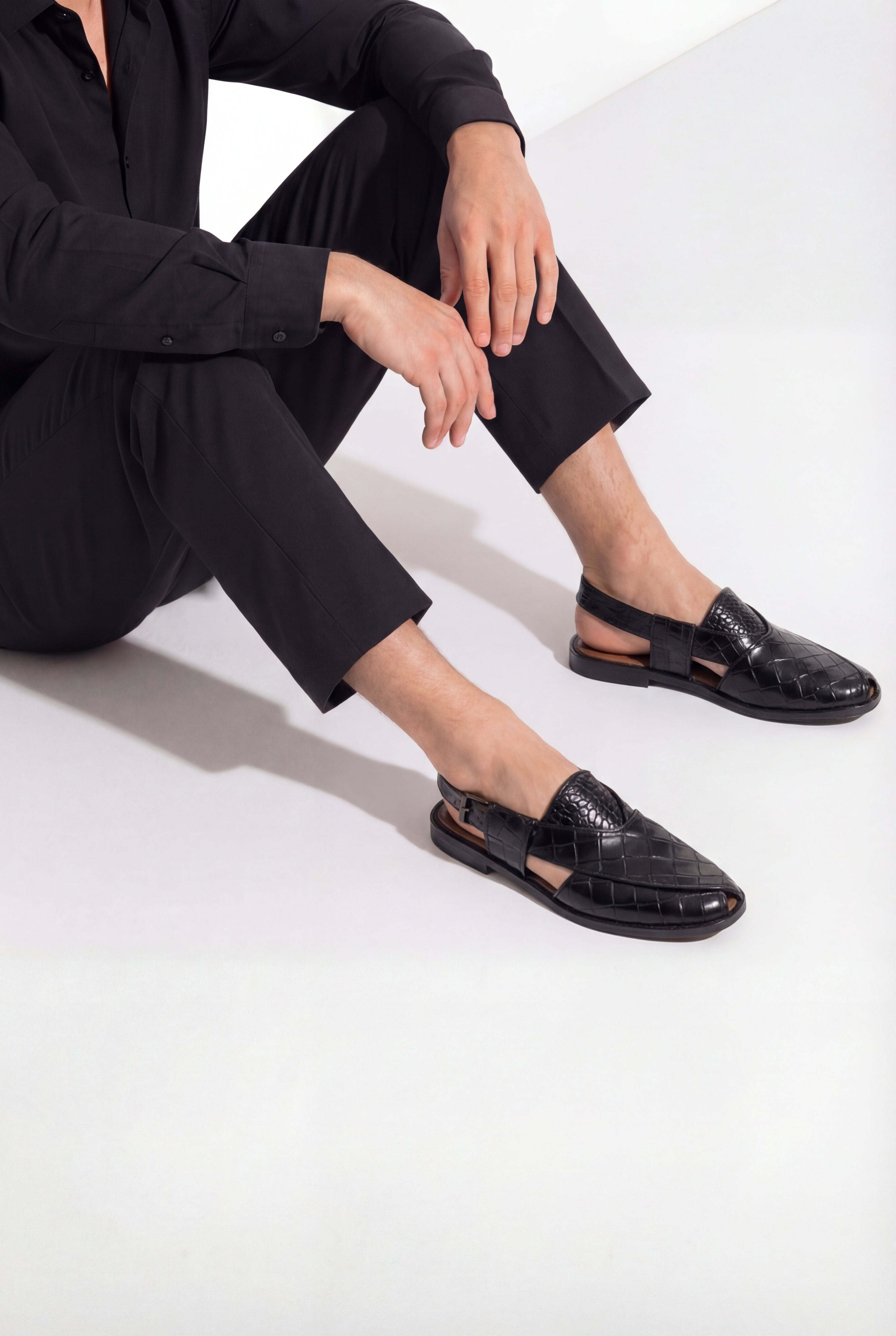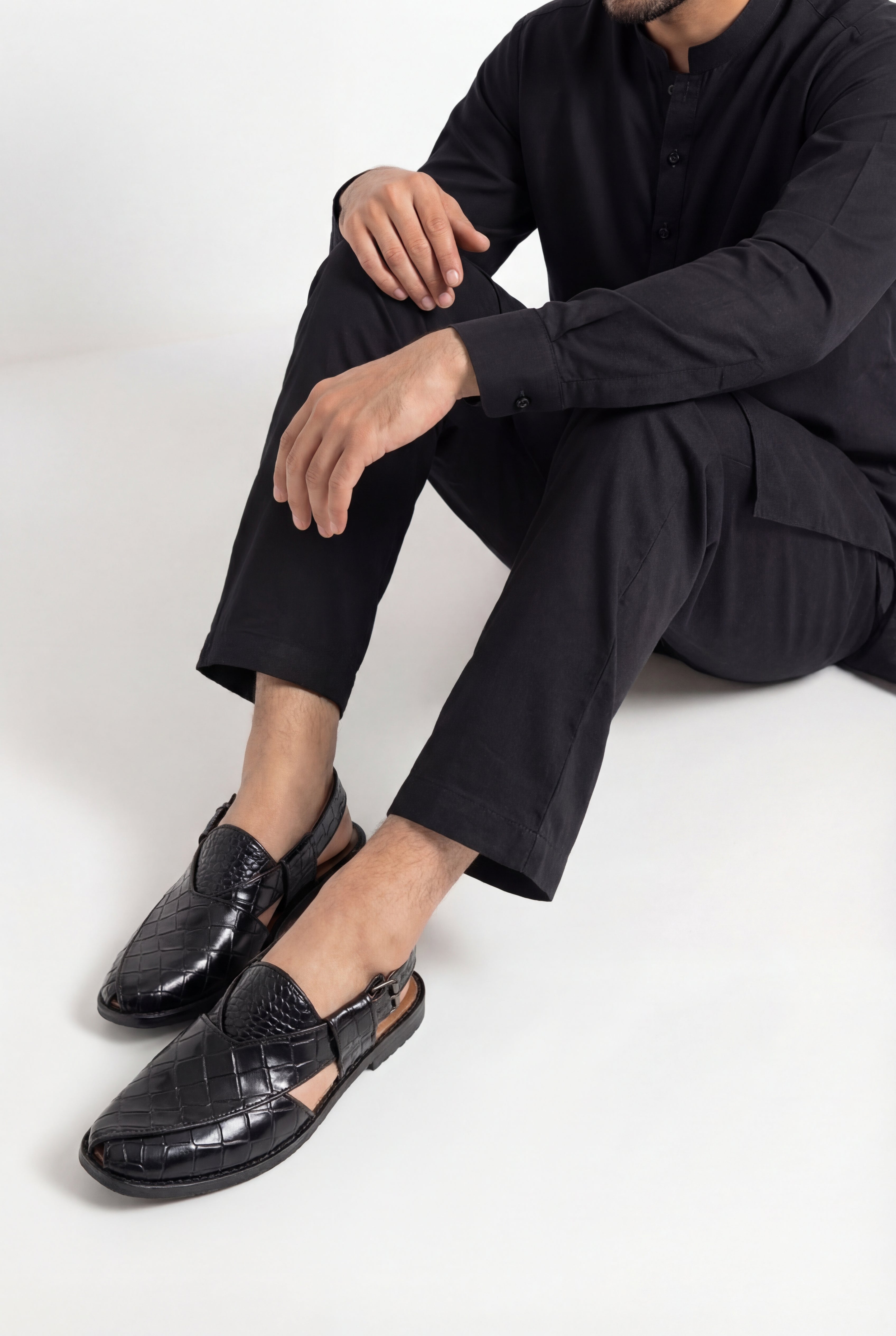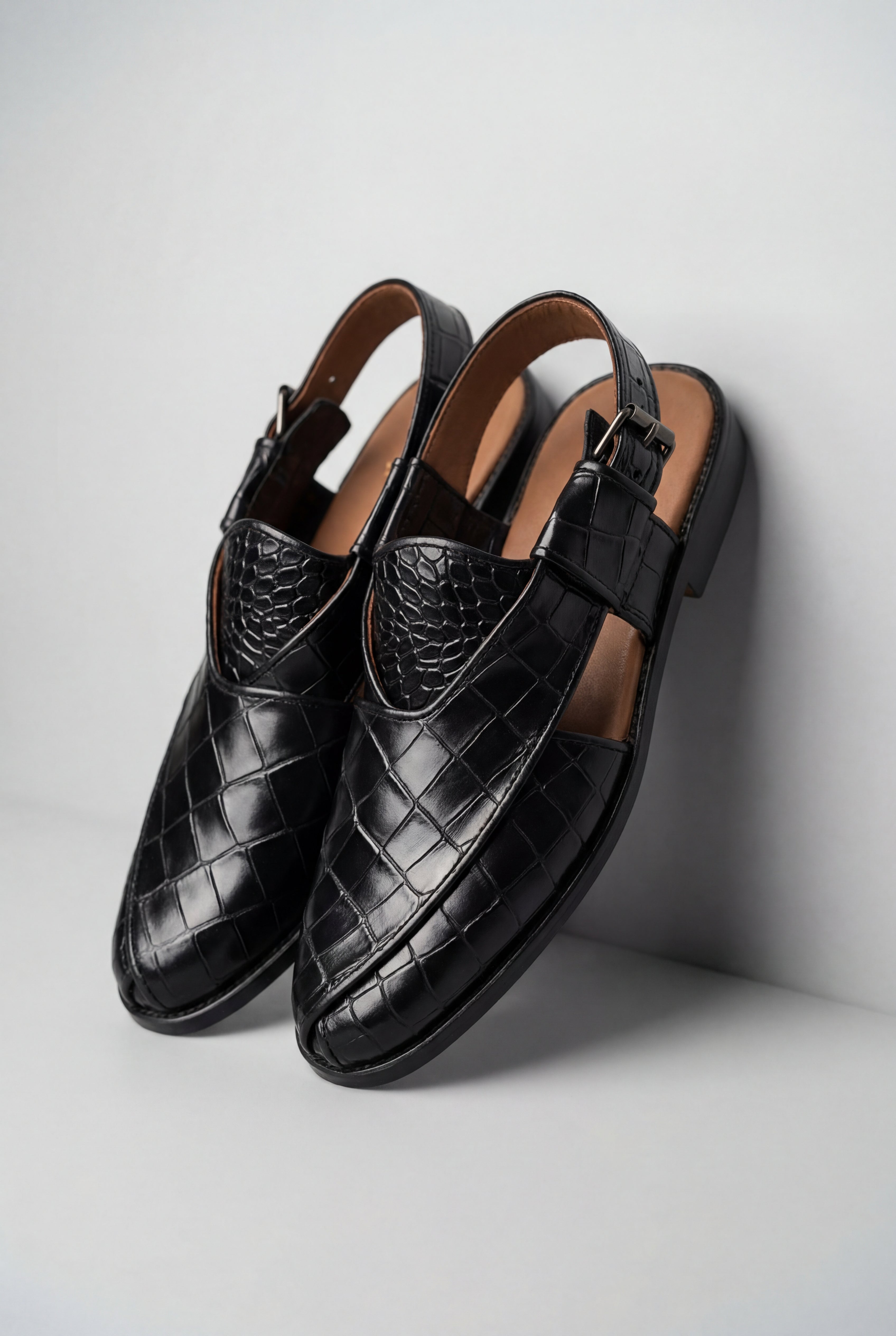Premium Black Croc-Textured Leather Peshawari Sandals. Crafted with precision and designed for the modern gentleman, these sandals combine traditional craftsmanship with contemporary sophistication. The glossy crocodile-embossed finish adds a bold, luxurious touch, making them perfect for formal gatherings, weddings, festive occasions, and refined everyday wear.
