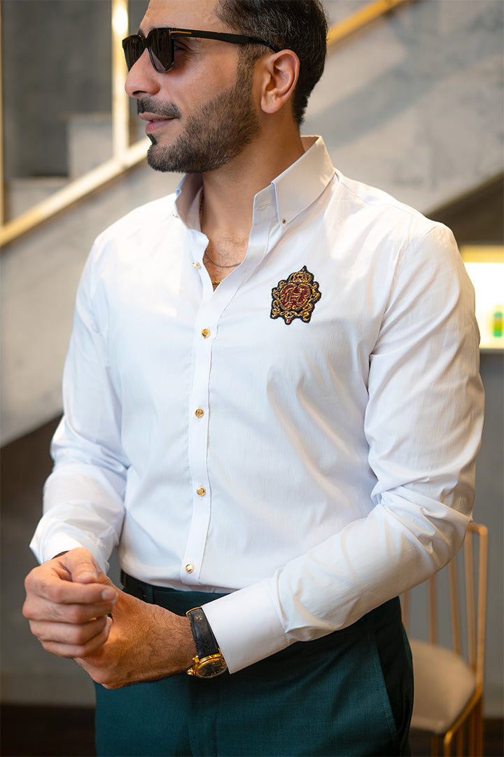 - A cotton shirt with full sleeves and slim fit, featuring timeless white colour and gold embroidered velvet applique signature logo for a bold, sophisticated look. Stretchable for added comfort