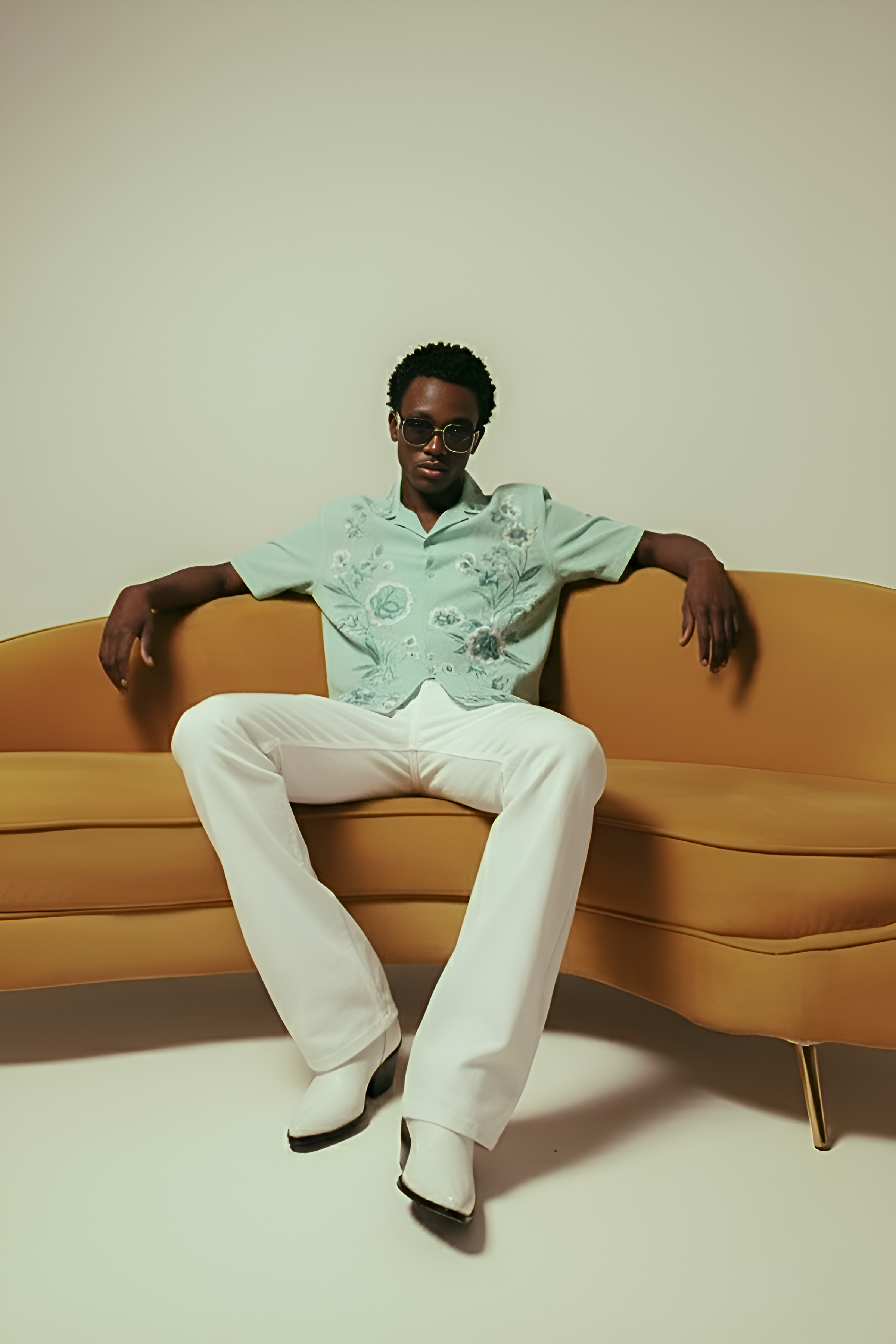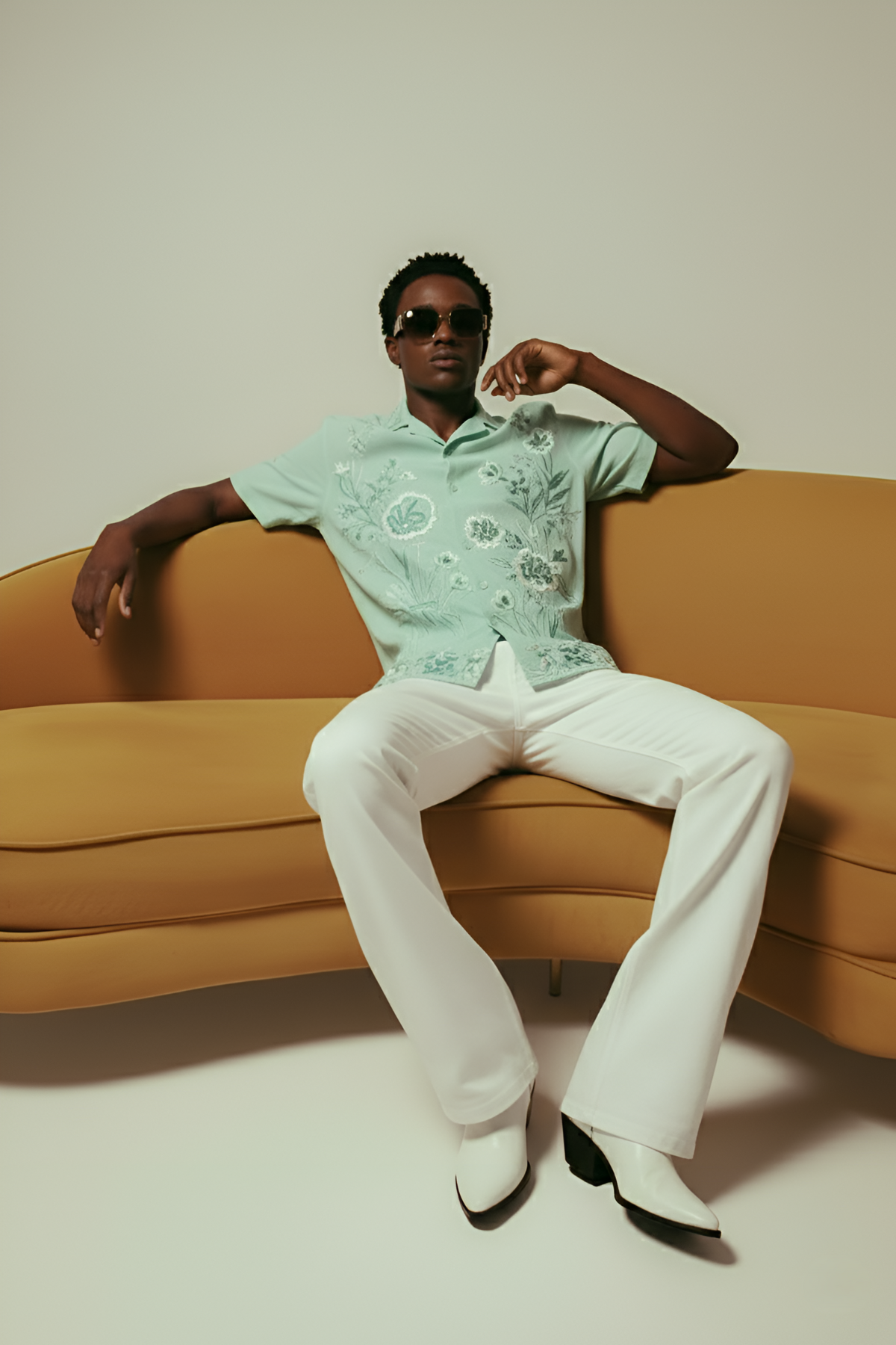 Premium mint green linen shirt, designed for effortless style and comfort. Crafted from lightweight and breathable linen fabric, this shirt keeps you cool while maintaining a refined look. The highlight is the intricate white floral embroidery across the front, adding a bold and artistic touch to the classic black base.The relaxed fit, short sleeves, and button-down design make it versatile for both casual outings and statement evening looks.