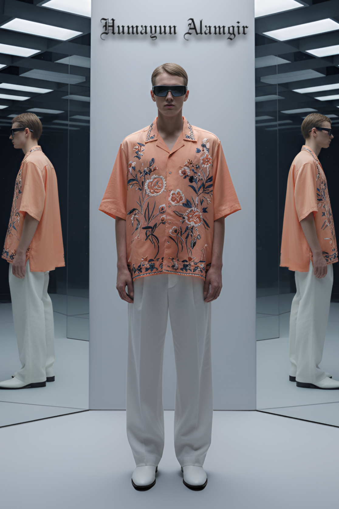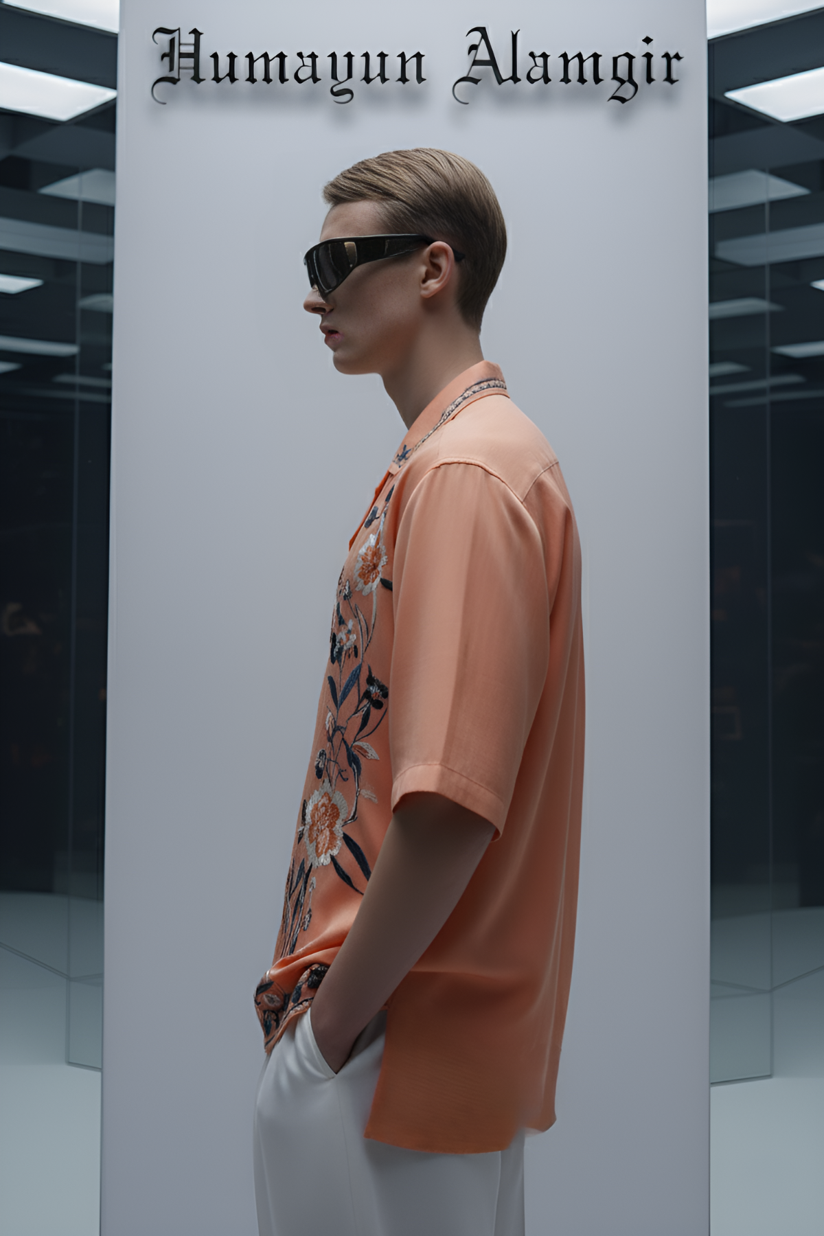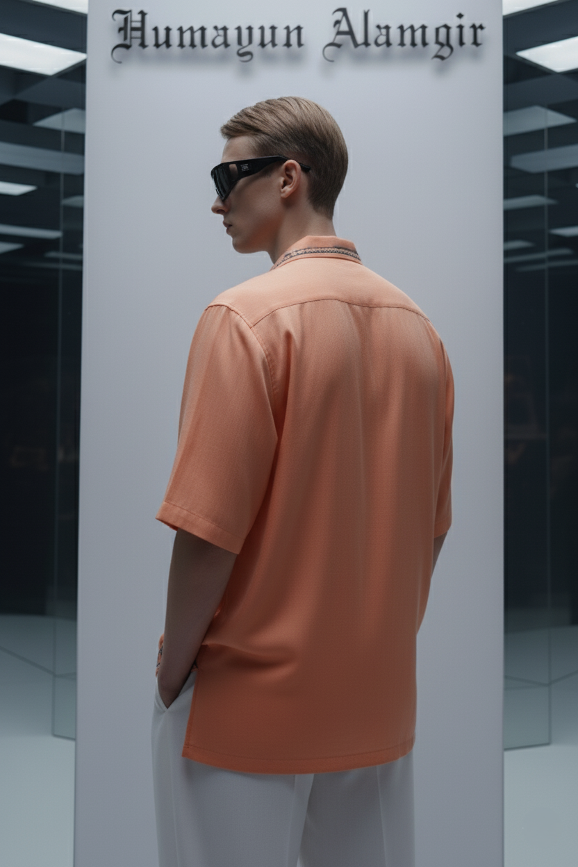 Premium peach linen shirt, designed for effortless style and comfort. Crafted from lightweight and breathable linen fabric, this shirt keeps you cool while maintaining a refined look. The highlight is the intricate white floral embroidery across the front, adding a bold and artistic touch to the classic black base.The relaxed fit, short sleeves, and button-down design make it versatile for both casual outings and statement evening looks.