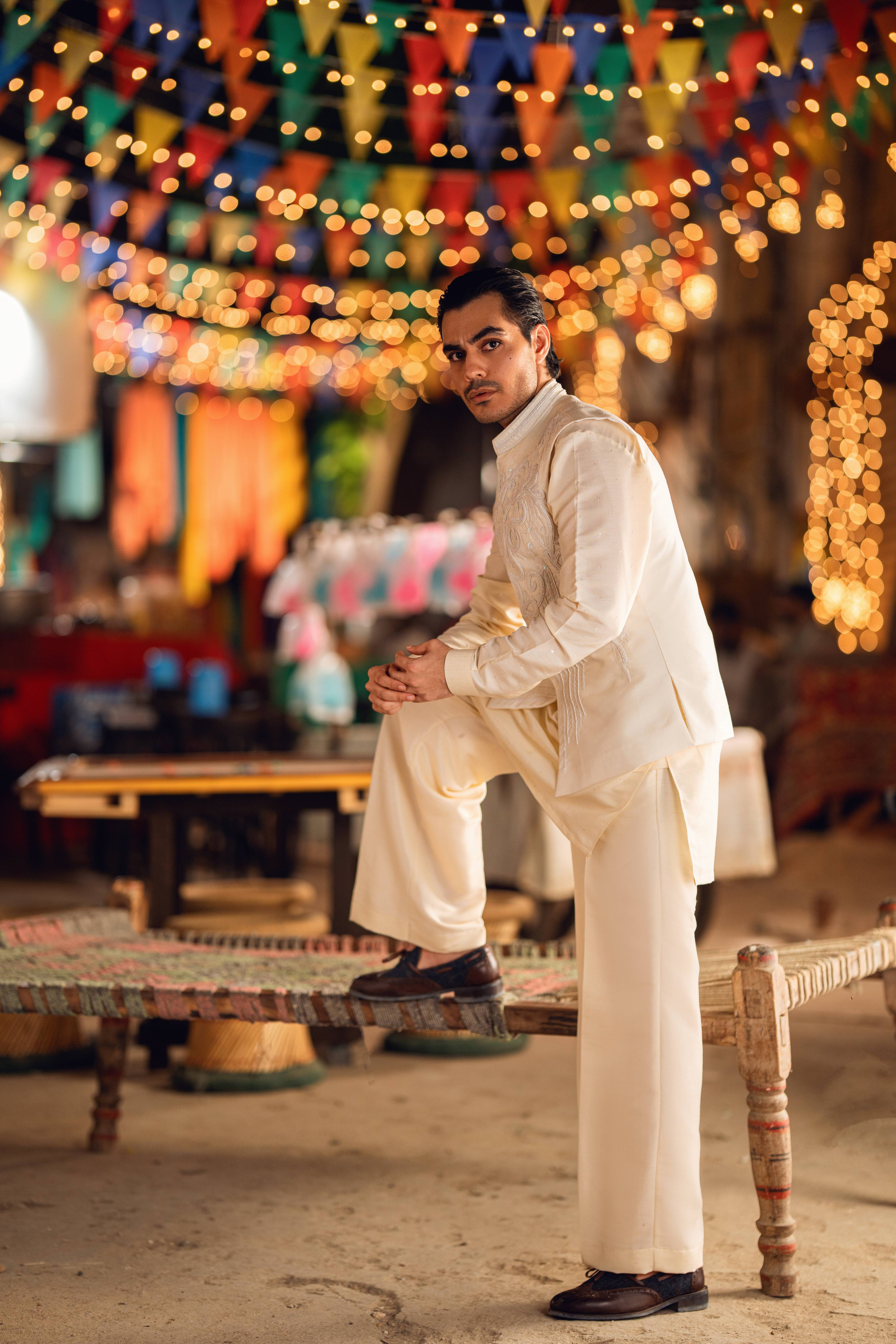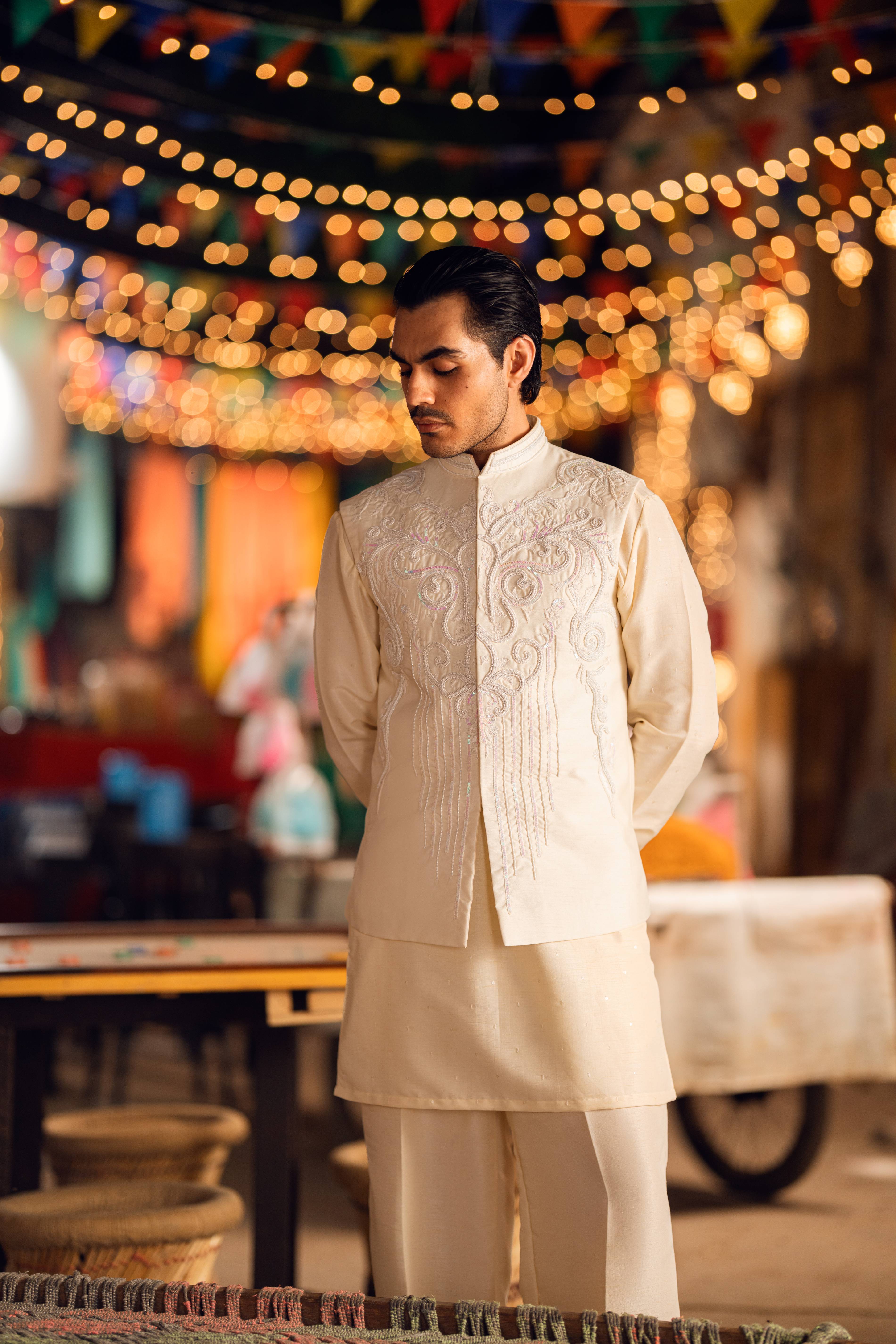 The Zavian Ivory Waistcoat Set embodies understated luxury. The