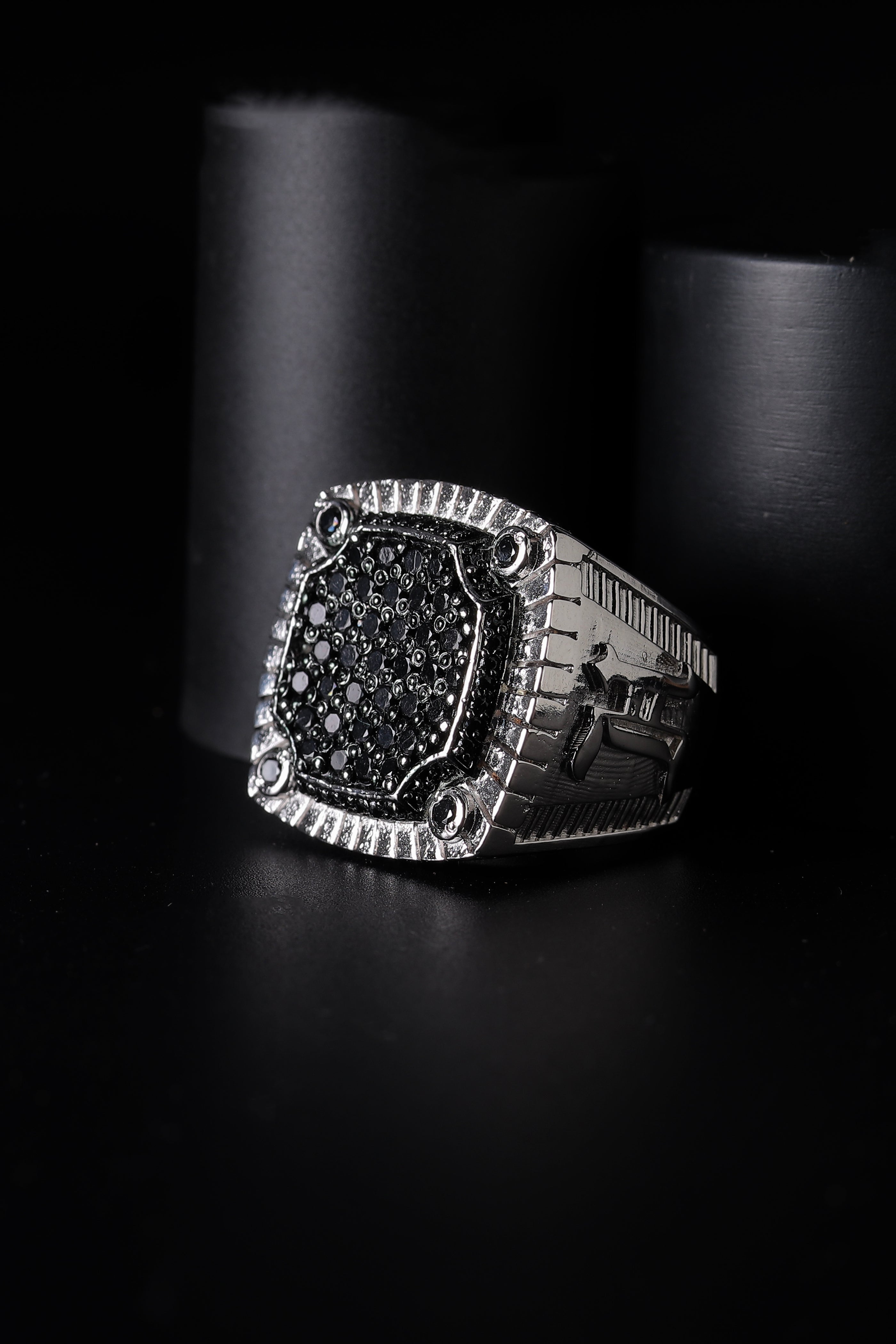 - Introducing the HA ring, meticulously crafted from 925 sterling silver. Handset with Supreme black Zircons, each stone exudes timeless elegance. Finished with luxurious rhodium plating for enduring brilliance.