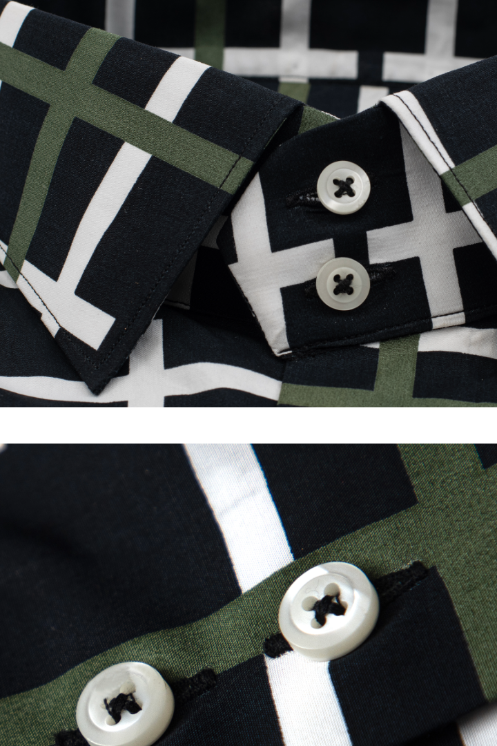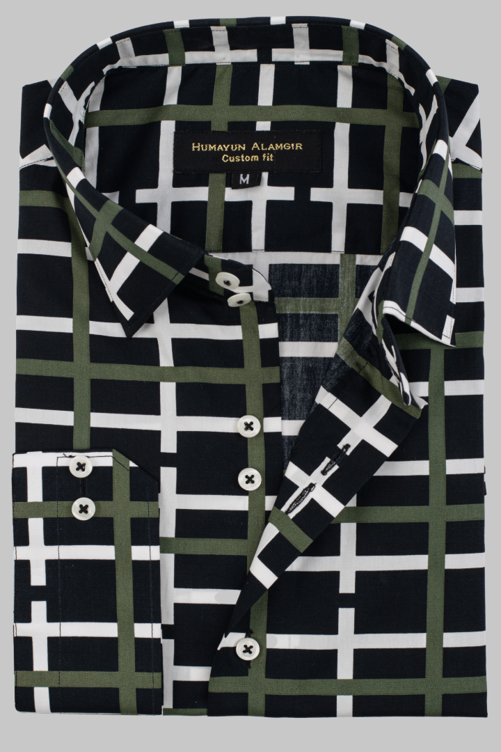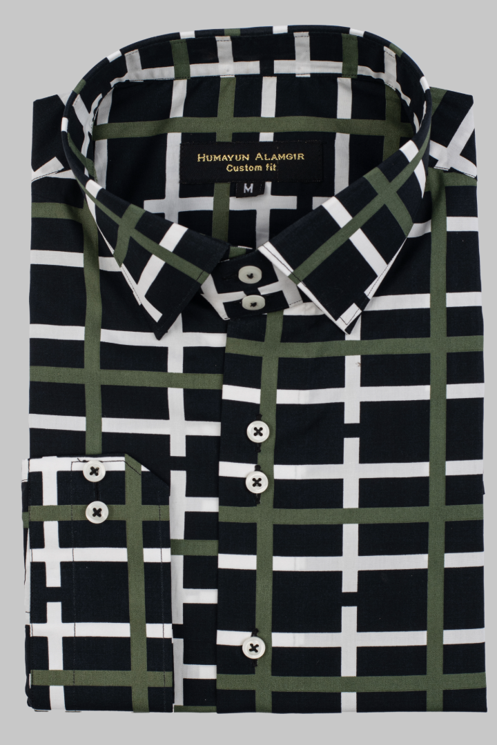 - High-quality black printed shirt with full sleeves and normal collar.