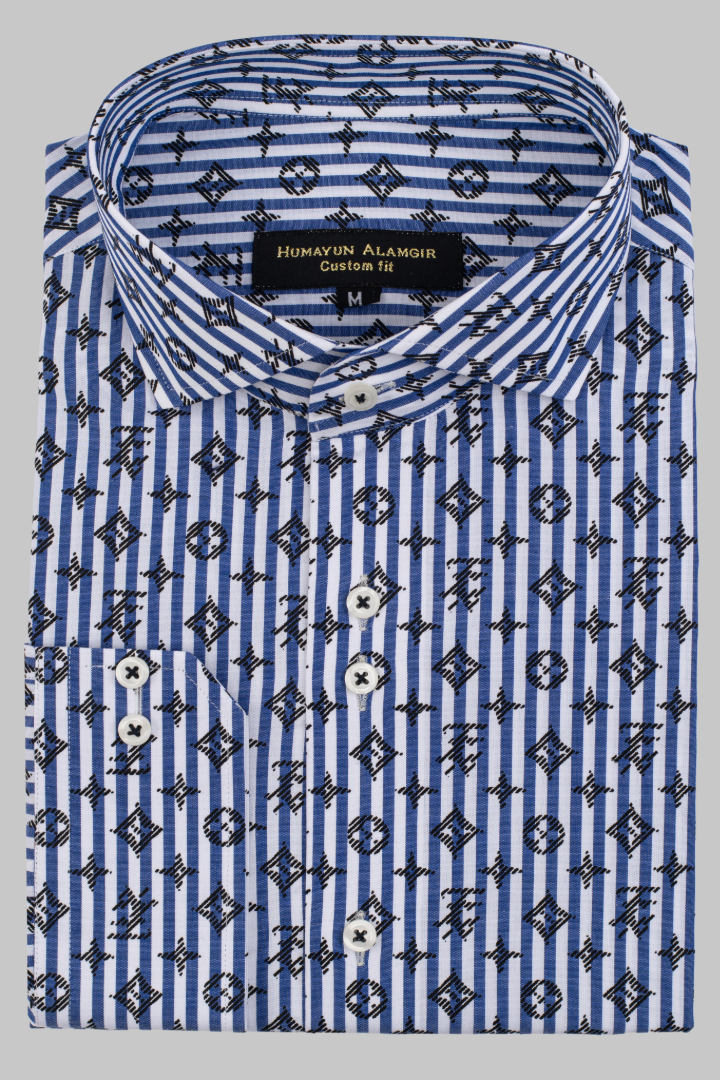 - High-quality blue stripe printed shirt with full sleeves and normal collar.