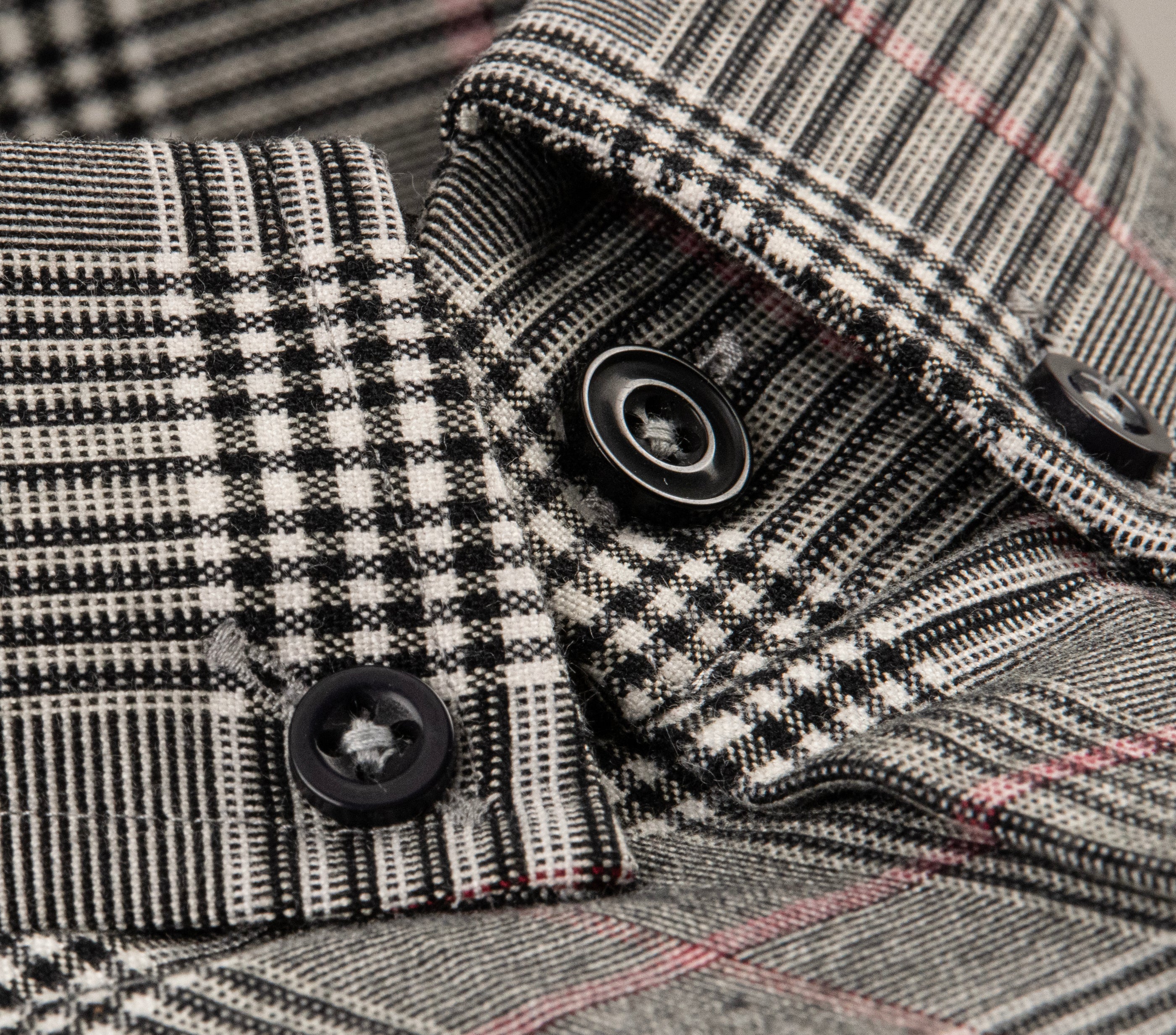 - Button-down collar shirt with multi-colored checks and flap pockets.