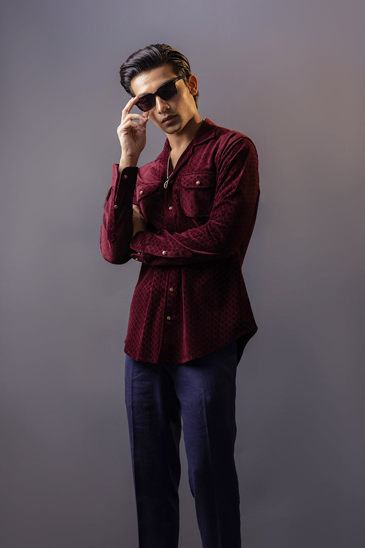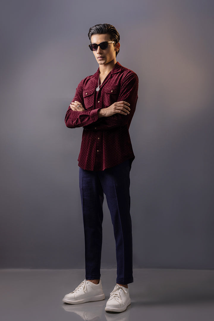 Maroon Self Print Velvet Shirt