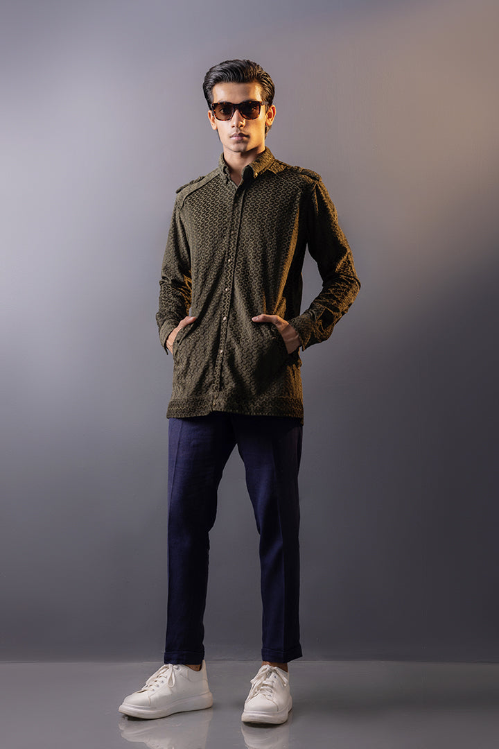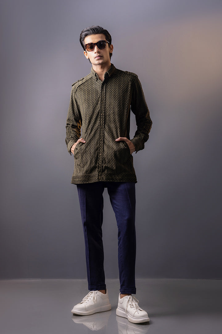 Olive Self Print Velvet Shirt