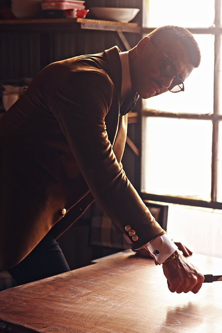 • The Brown velvet Tux features an American collar, a Ticket Pocket Black pant, and a White tuxedo Shirt for a classic and elegant look.