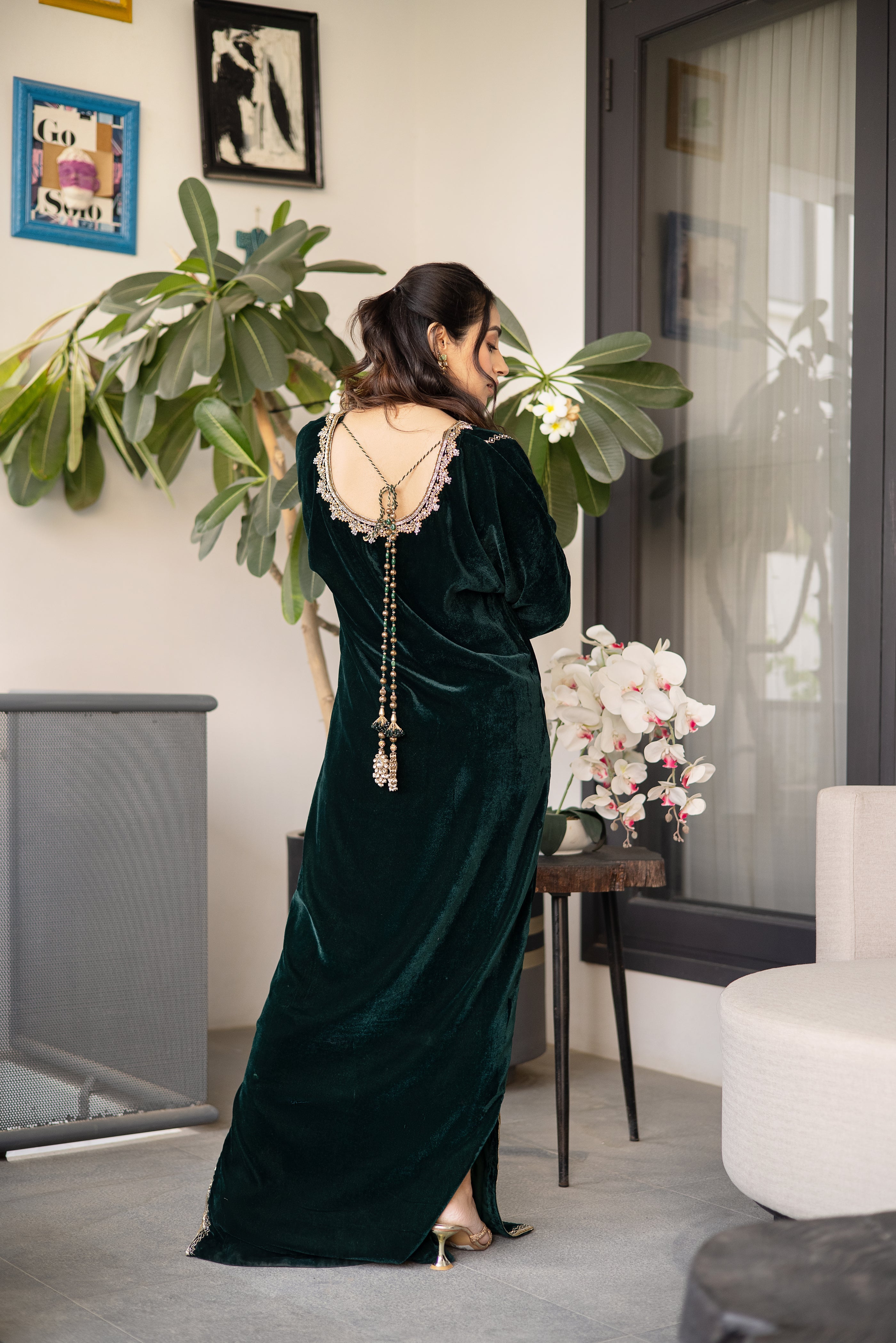 - Green Verte Caftan is a 1-piece, velvet handmade garment embellished with customization options. Dry cleaning is the only recommended cleaning method. Delivery of the item is expected to take 2-4 weeks. Please note that the actual colors of the item may appear differently on your device.