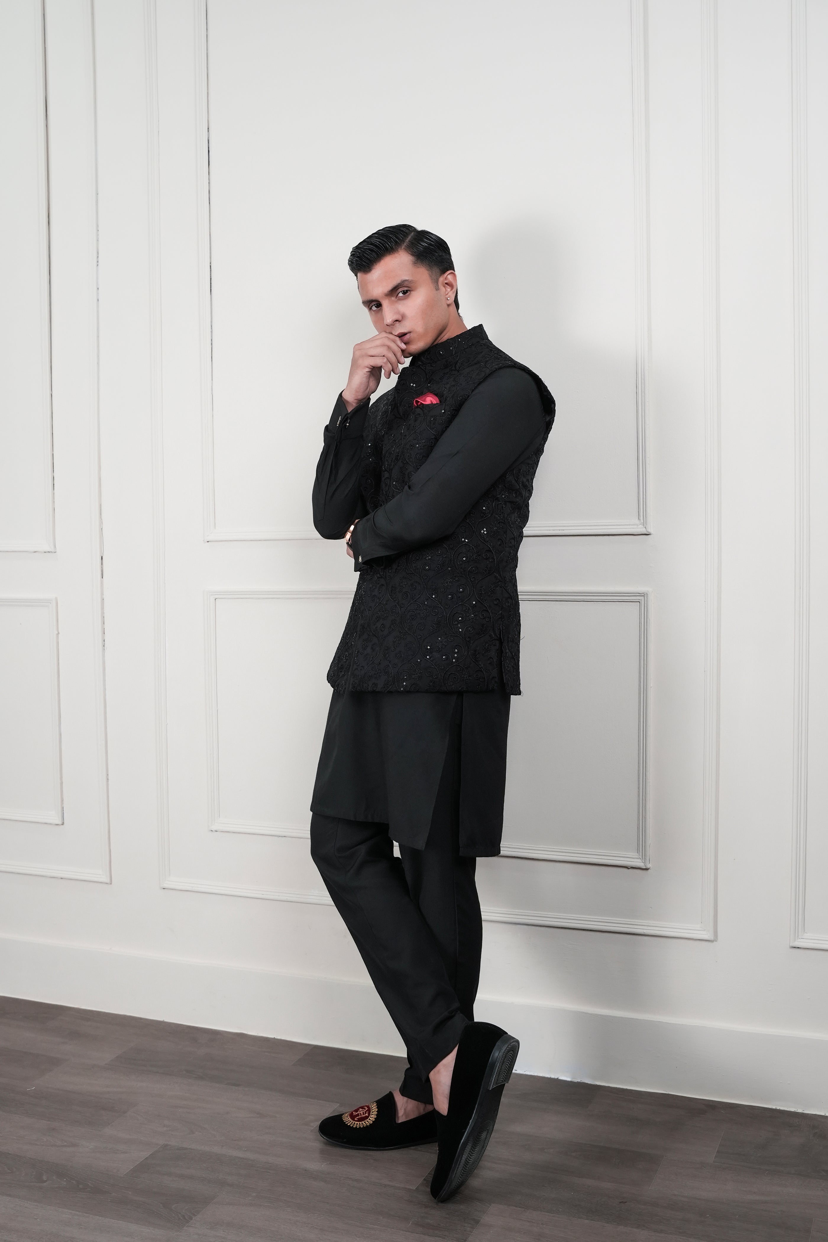 BLACK EMBOSSED SEQUENCE WAIST COAT