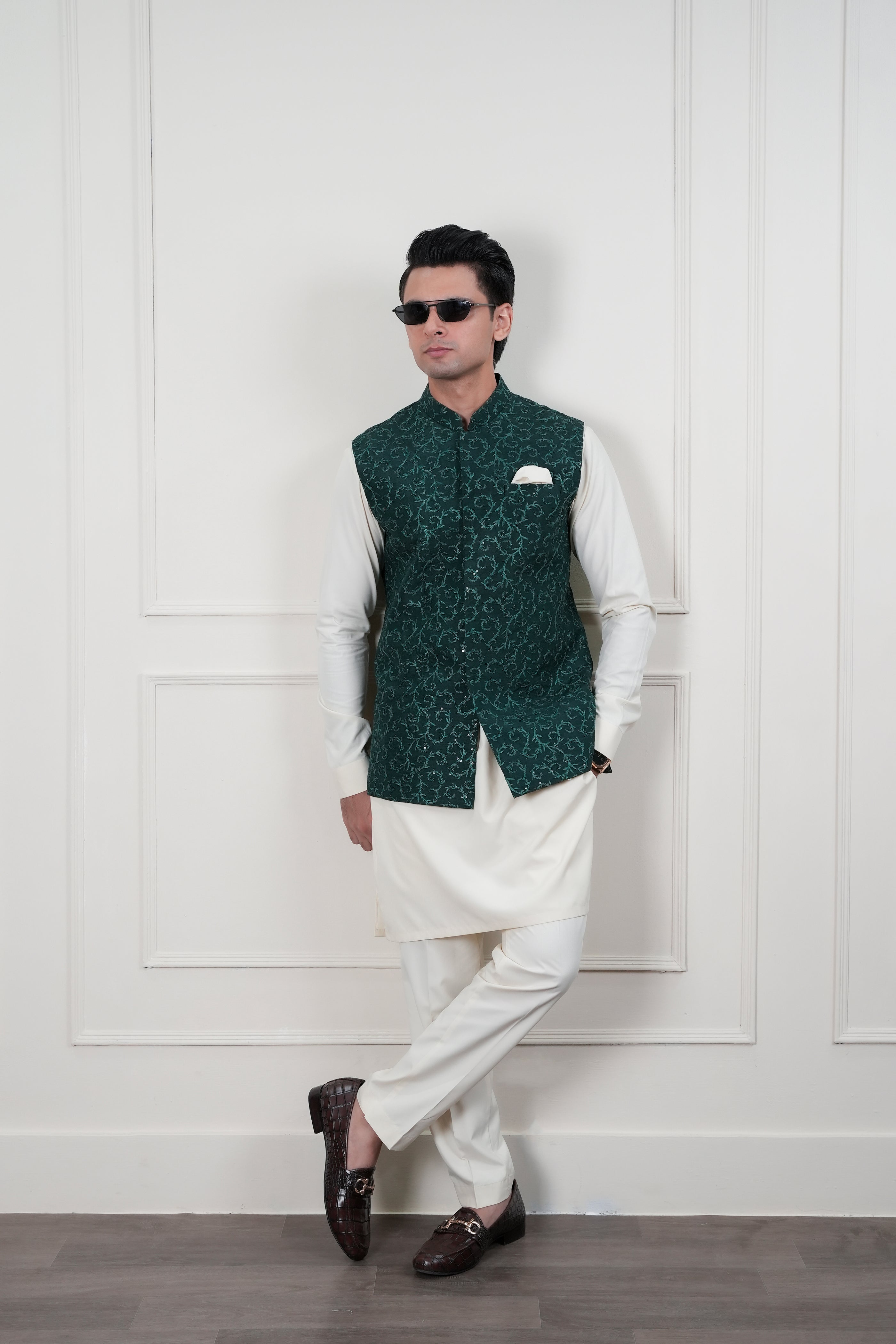 GREEN SEQUENCE EMBROIDERY WAIST COAT