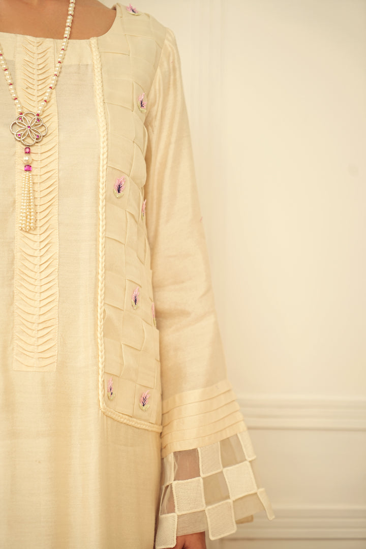 - Khaadi Silk, Khaadi Net, Hand Embroidery with Silver, Pink, and Green Colours.