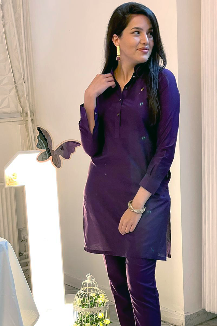 - Elegant and high-end, this purple cotton silk kurta pajama set features a "H" signature logo, mandarin collar with metal buttons at the neckline and cuffs, and a matching cotton silk pajama.