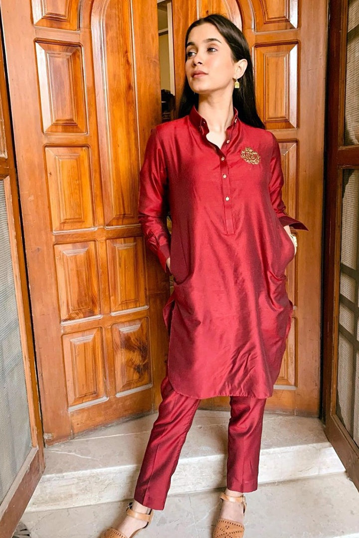 - This red cotton silk kurta pajama set is immaculately crafted with a gold "H" motif, providing a charming look. For all-day comfort, it is designed with impeccable attention to detail. An overall versatile choice.