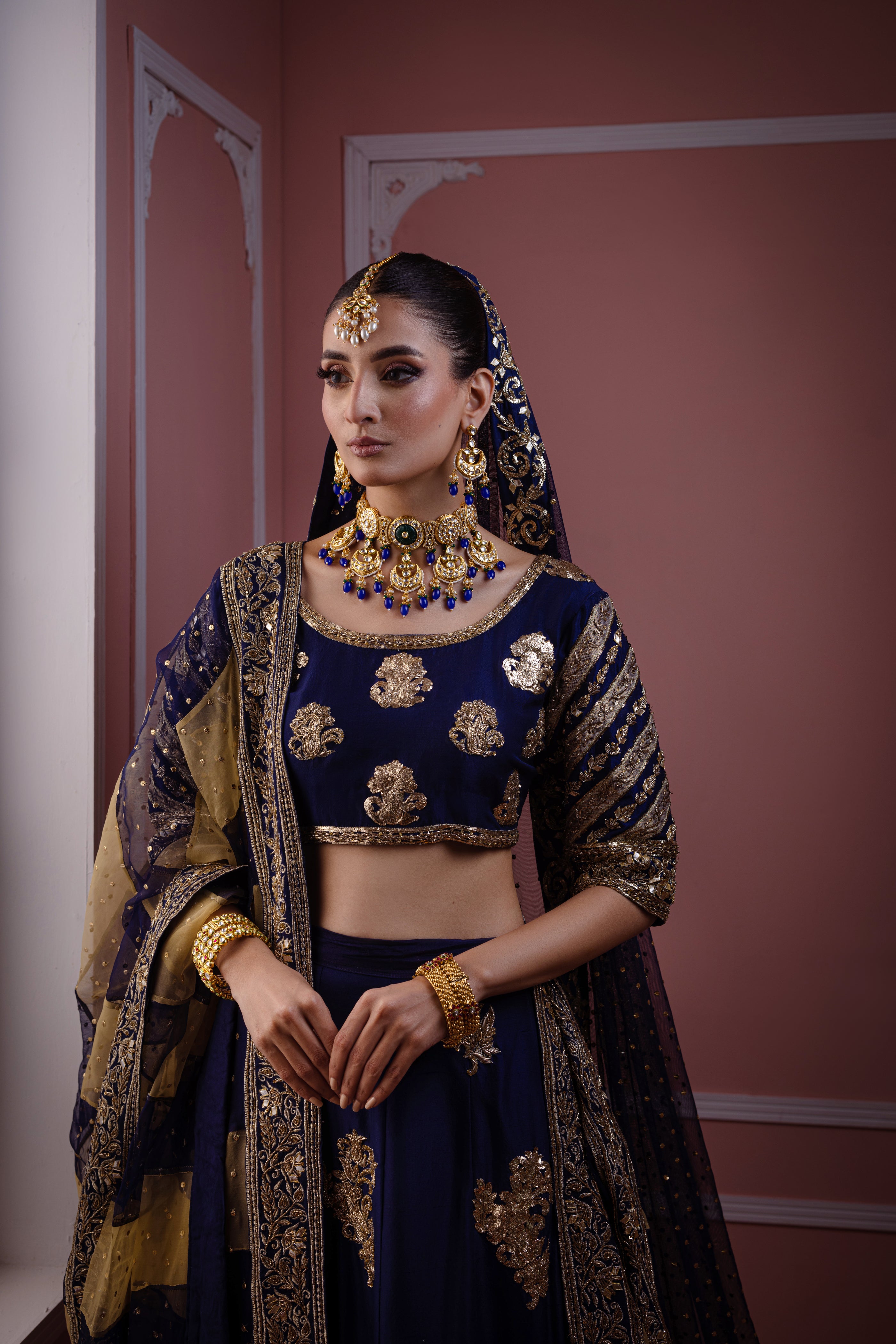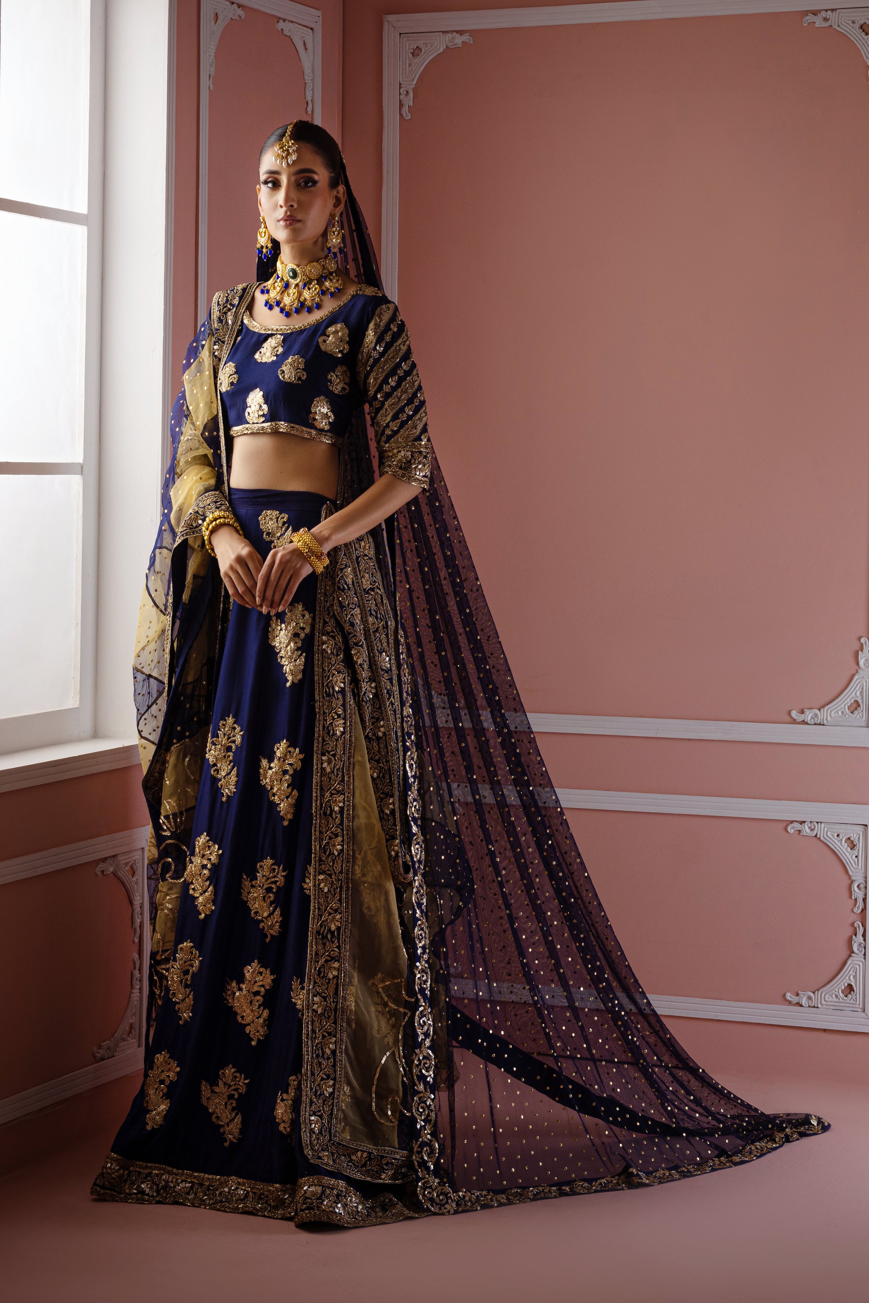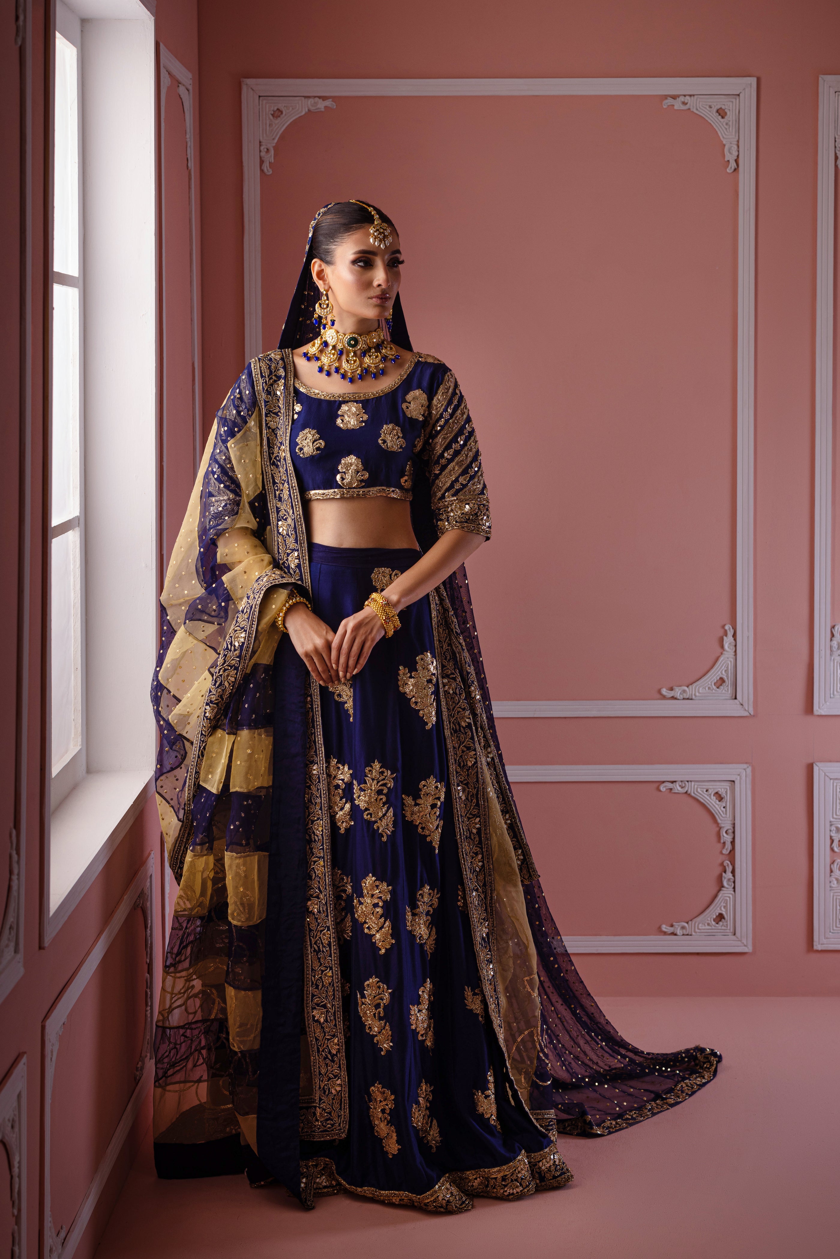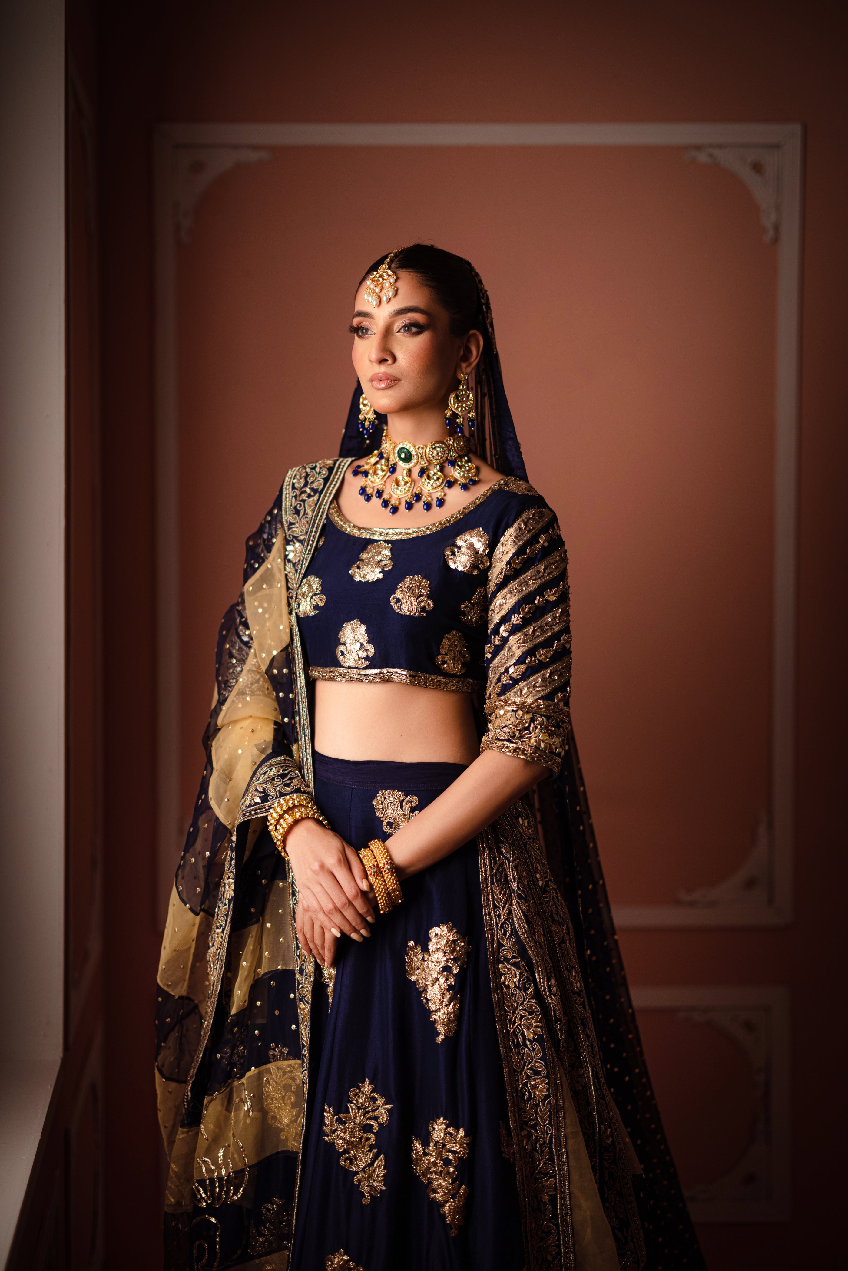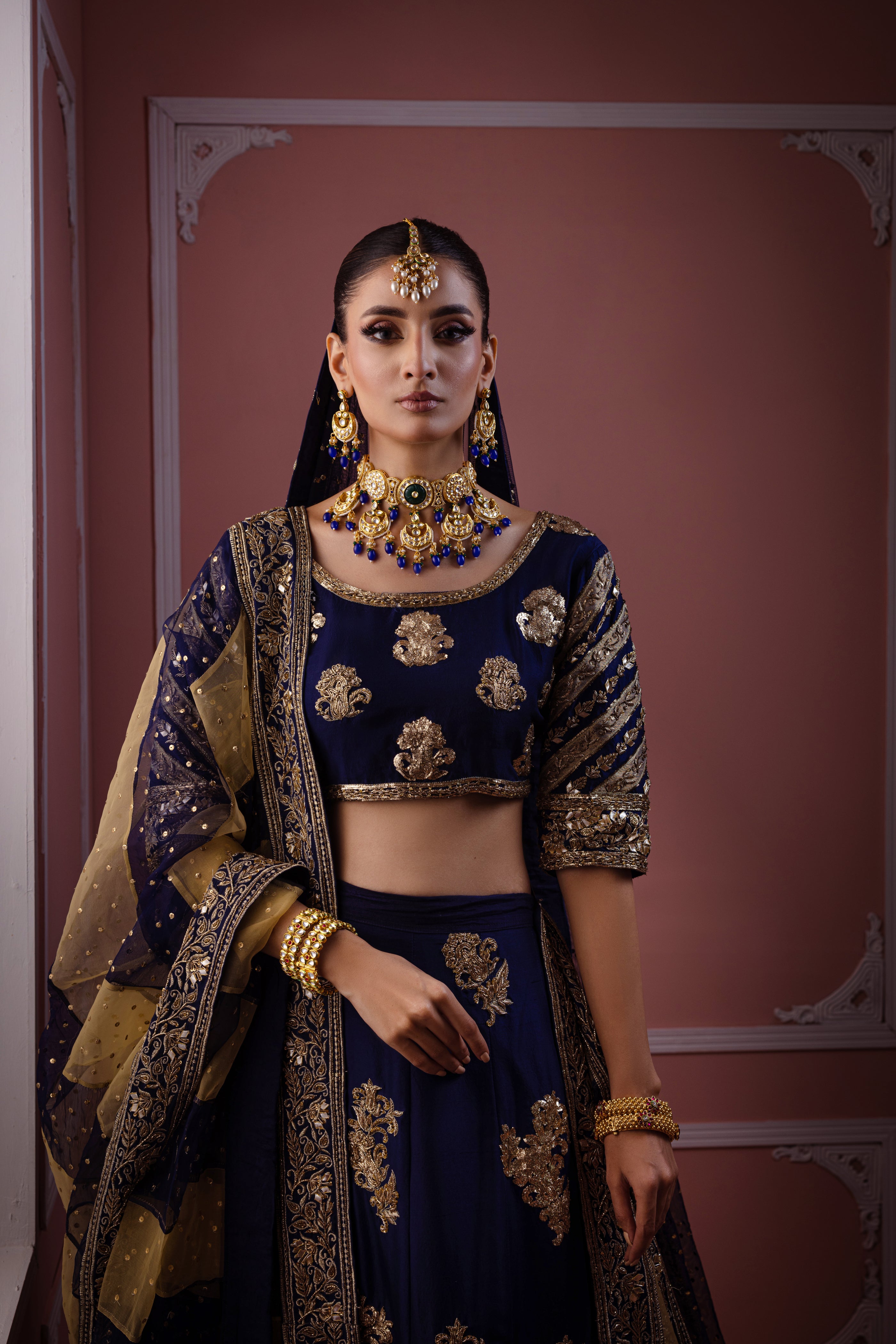 HEER bridal dress features a blue and gold color scheme, intricately decorated with sitara and tussles. The set includes a blue Ghagra Choli and a handcrafted organza dupatta. Showcasing grace and beauty, this ensemble will be remembered for years.
