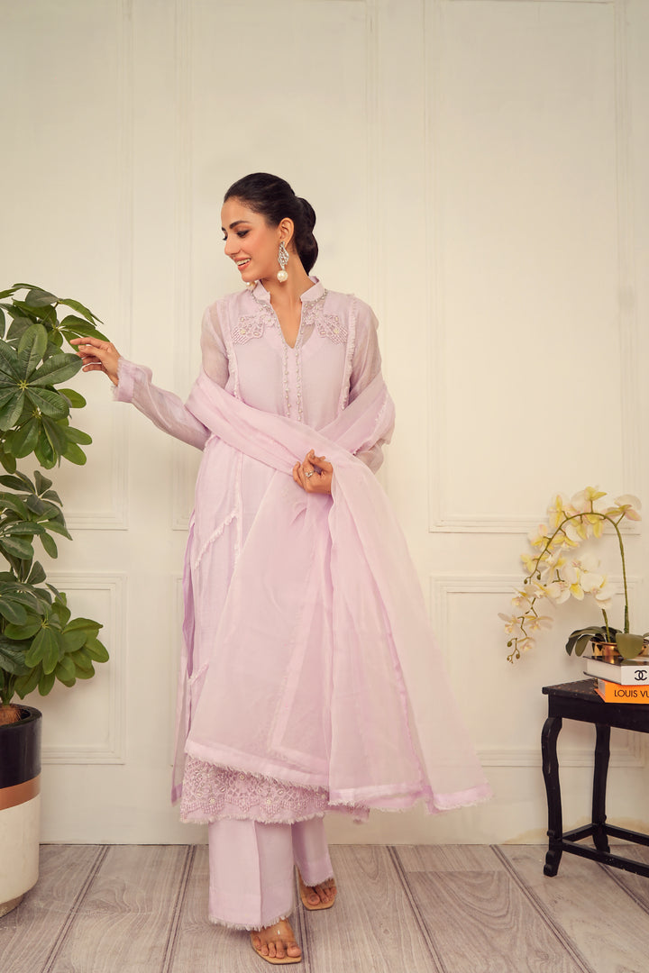 - Khaadi Net Organza pant, shirt, Shameez, and dupatta featuring intricate handwork.