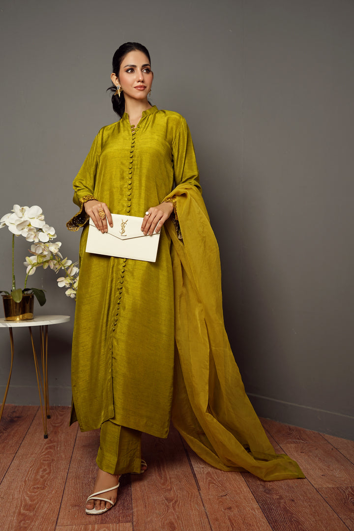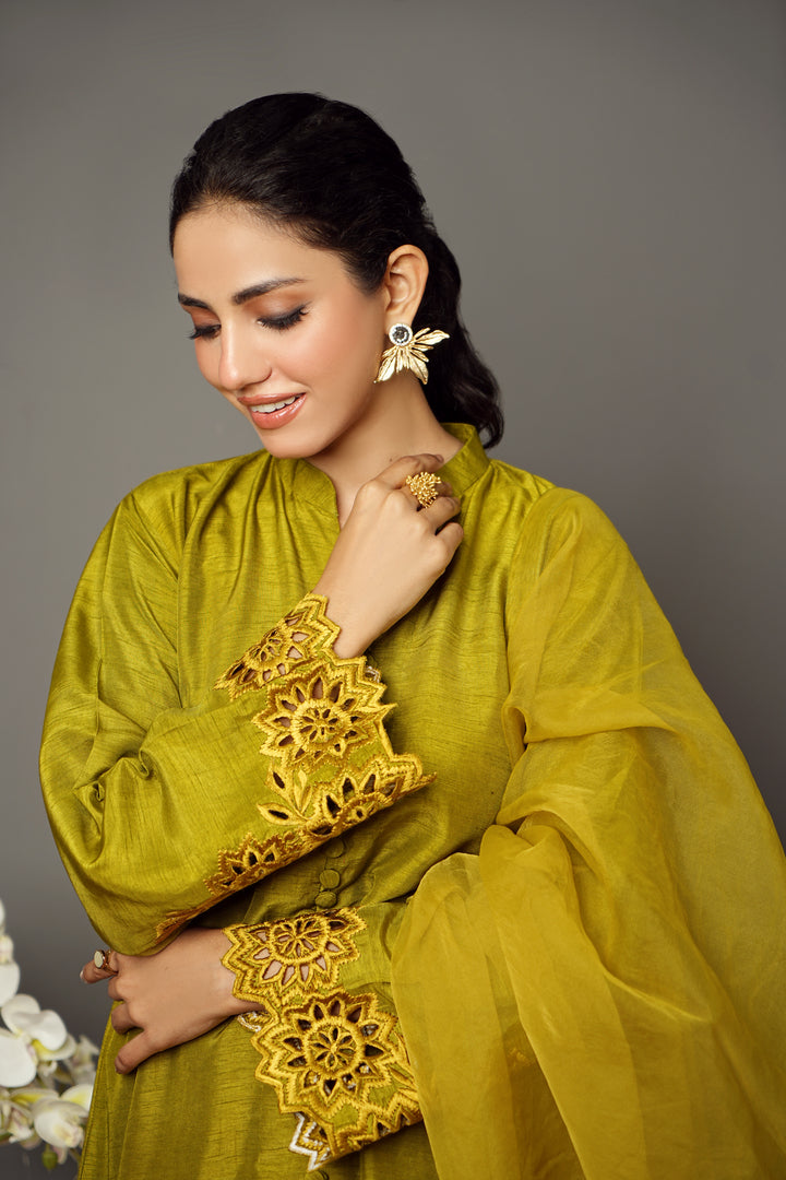 - Korean silk Organza shirt, trousers, and dupatta featuring intricate embroidery.