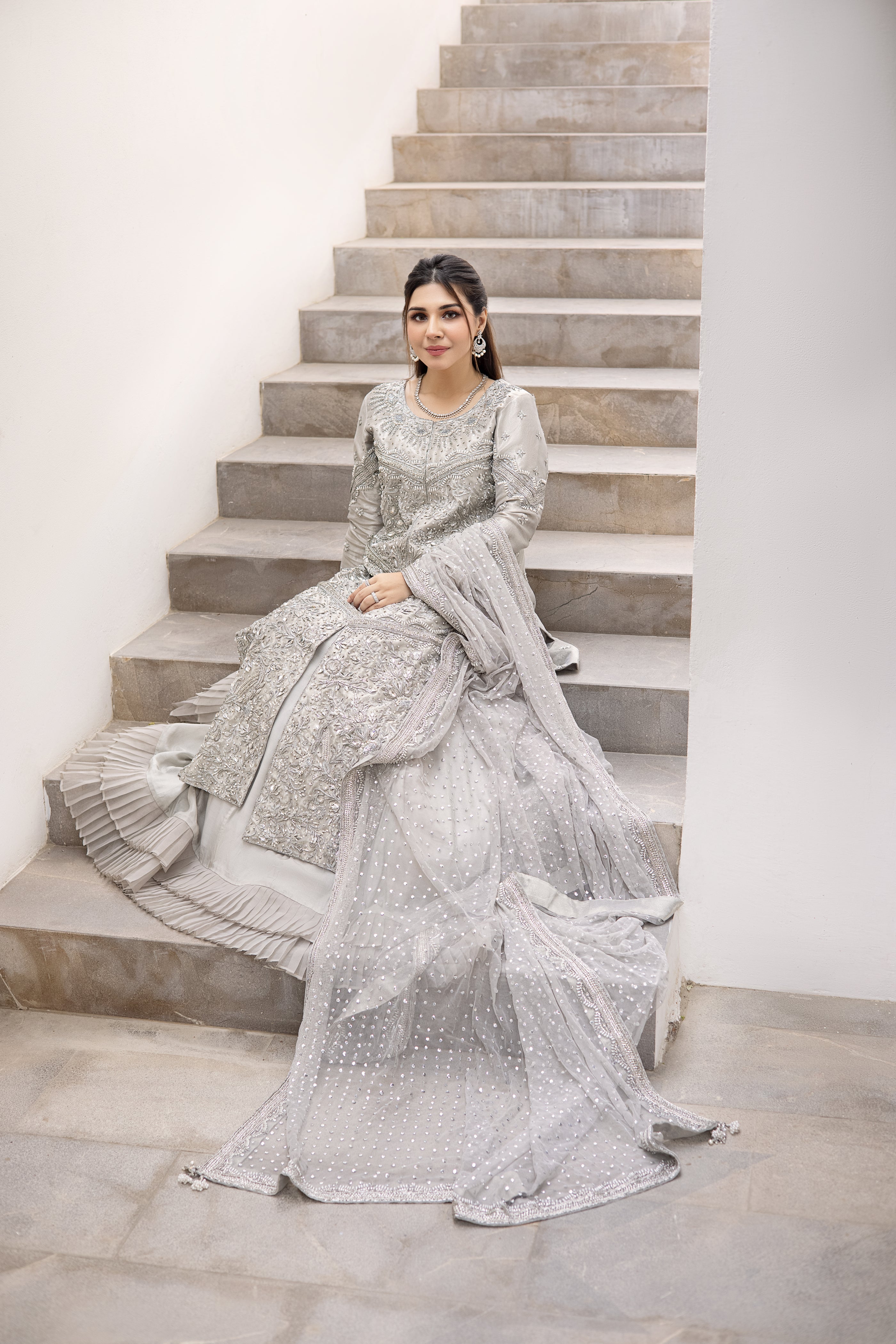 - Silver sharara with organza frill, handwork fabric, and 4-side border on net dupatta. Note: Color variations may occur due to device display.