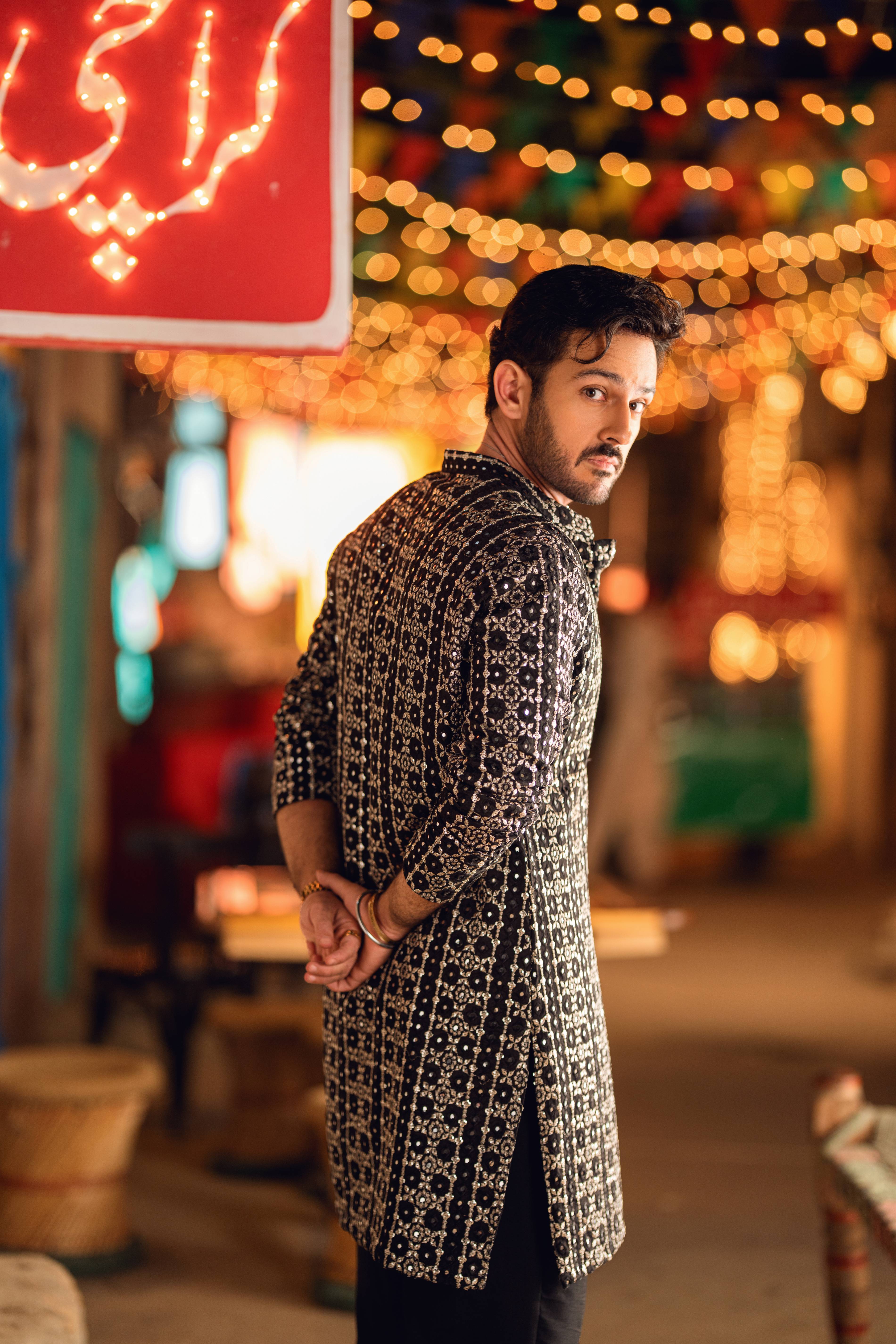 - Straight cut kurta with full sleeves, paired with wide leg trousers (shalwar-style) for a traditional silhouette